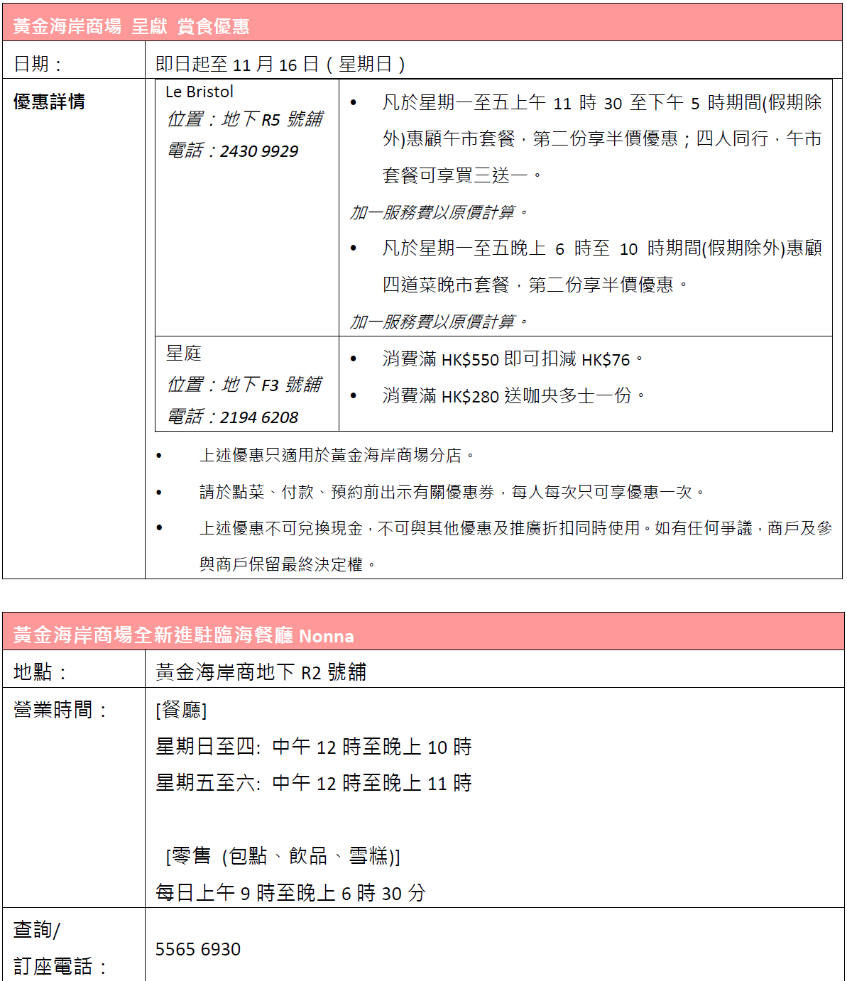 黃金海岸商場精選人氣餐飲商戶推出中秋限定「賞食優惠」,包括法國餐廳Le Bristol及新加坡海南雞飯專門店星庭,無論是二人還是四人都可以享有指定優惠,讓大家分享中秋愉悅滋味!由即日起至11月16日期間指定日子及時段,凡惠顧Le Bristol午市或晚市套餐,可享第二份享半價優惠,午市套餐四人同行更可享買三送一超值優惠;而於星庭消費滿HK$550可扣減HK$76,而消費滿HK$280則可免費享用咖央多士一份。