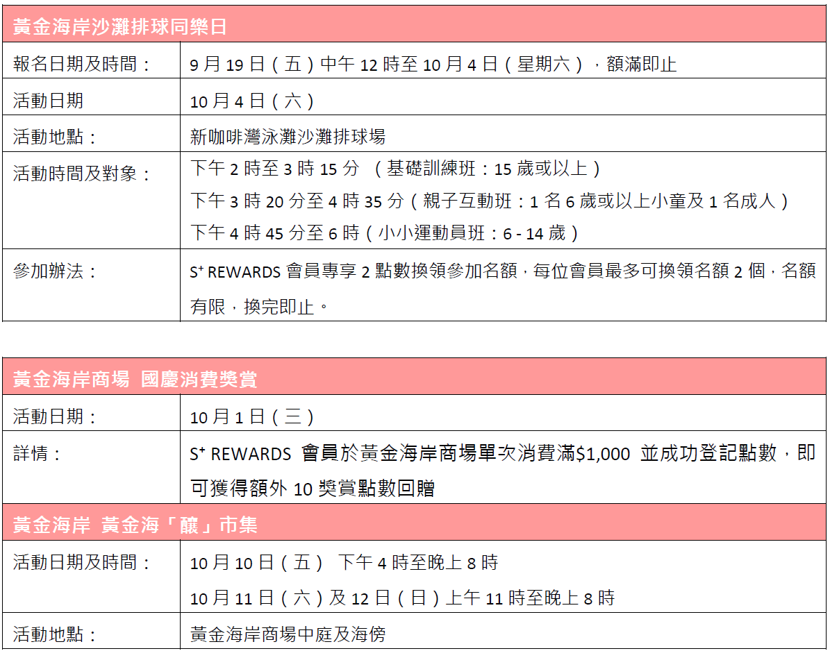 黃金海岸商場將於10月4日在新咖啡灣泳灘舉行「黃金海岸沙灘排球同樂日」,為10月11日舉行的屯門沙灘節2025及全運會沙灘排球比賽提前預熱,率先體驗沙灘節的樂趣。10月10日下午4時起至10月12日黃金海「釀」市集,商場中庭將雲集本地精選釀製品牌,推出海洋及海邊主題手作,售賣不同特色手工啤、本地咖啡豆、手工醬料、雪榚等,打造本地精釀文化。
