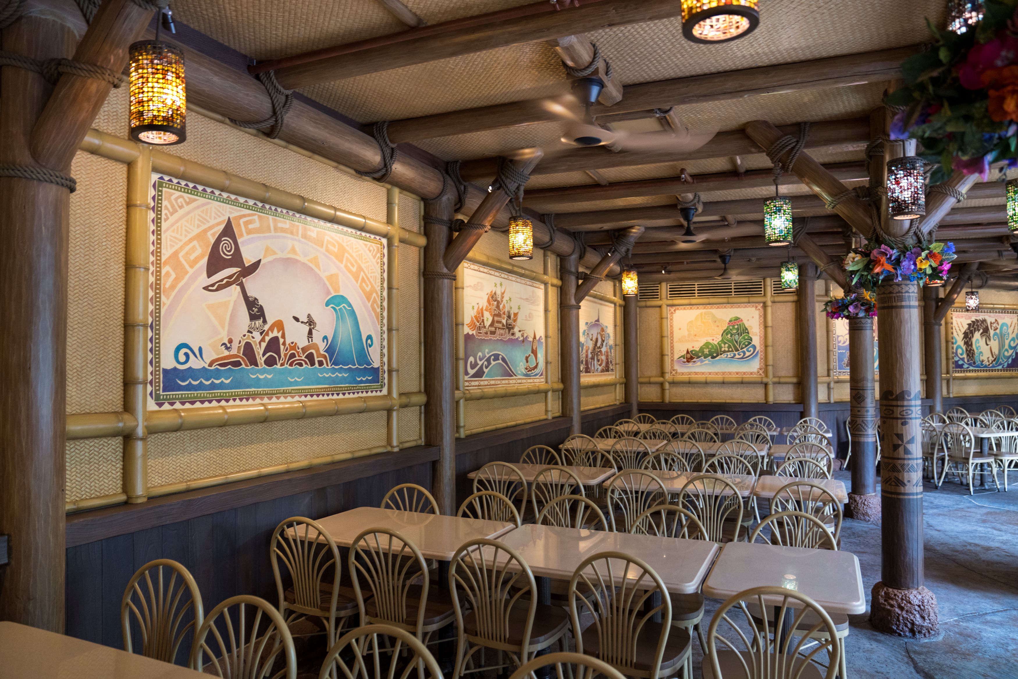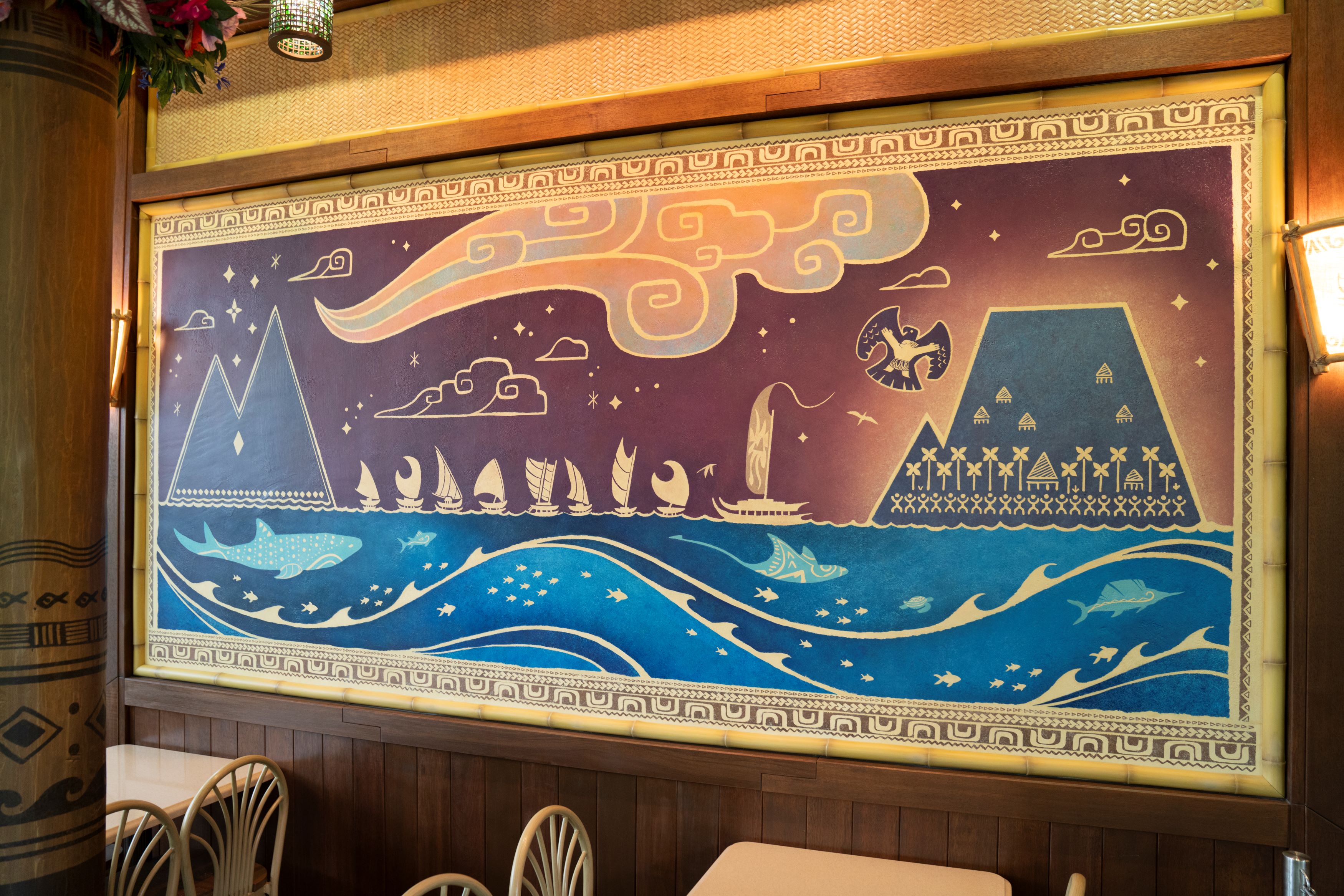 餐廳中央的棕櫚葉圖案柱子呼應慕安娜村落的建築以及美學風格;餐廳內通過天文星象、潮汐漲退、雀鳥飛行動態與風向變化等裝飾元素,巧妙地描繪了傳統航海技術的奧秘及精髓。餐廳右側展示8幅相連的手繪壁畫,重現慕安娜在《魔海奇緣》與《魔海奇緣2》中慕安娜橫渡重洋、破浪冒險的故事。