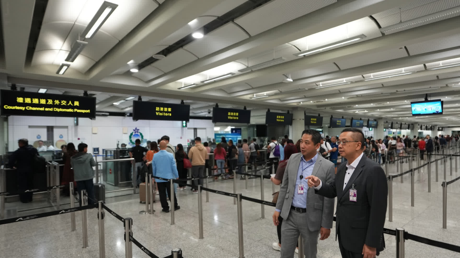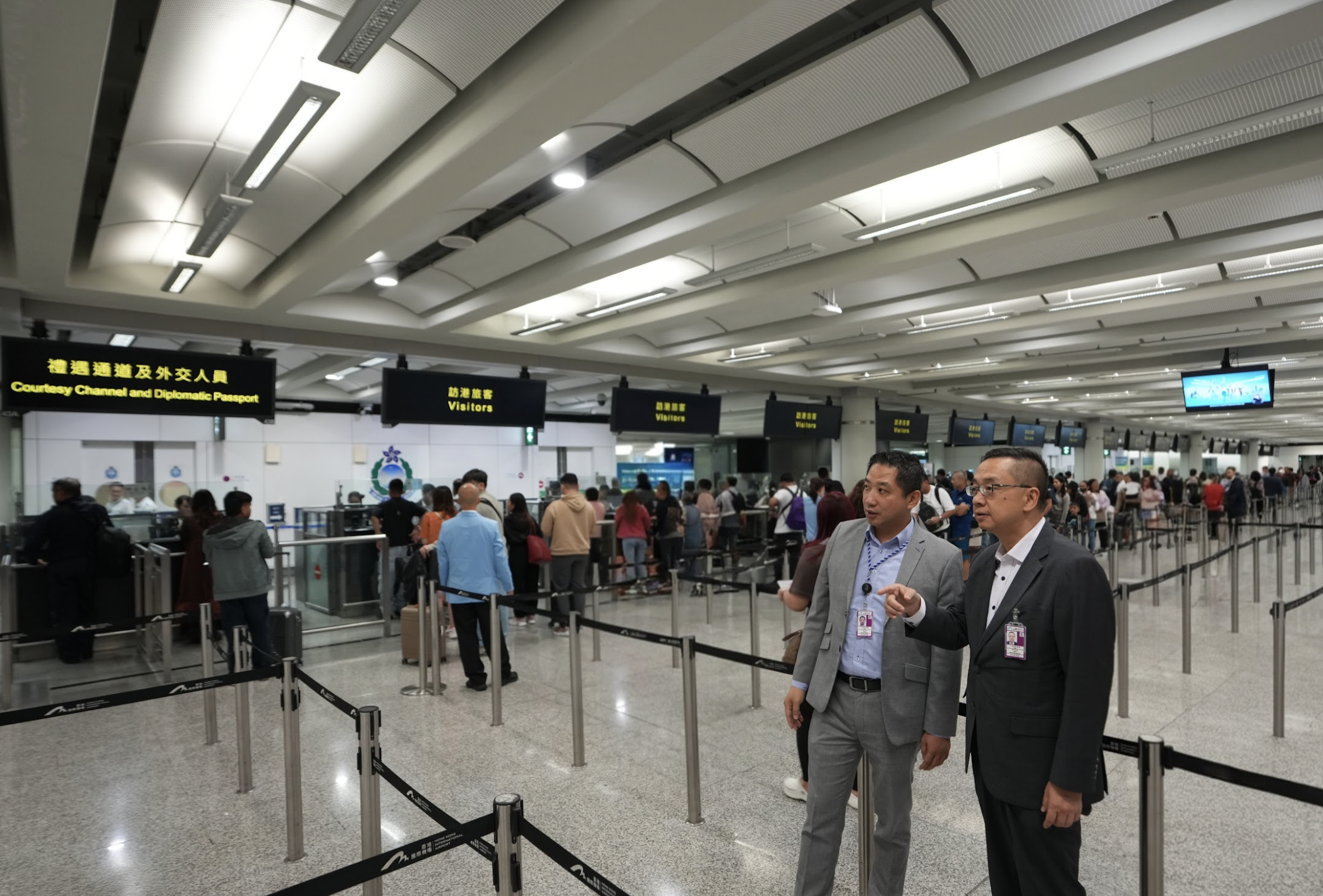 今日早上,機場航班陸續恢復升降,預計機場今日將非常繁忙。為確保通關繼續順暢有序,機場管制站前線人員利用航班乘客數據,靈活調配人手,預先在旅客出入境高峰時段加開檢查櫃台和e-道,維持口岸高效運作。部門也超前部署,抽調超過100名來自其他崗位的同事協助機場管制站的前線工作,加開額外檢查櫃台和e-道,全力做好航班恢復正常後的出入境服務。