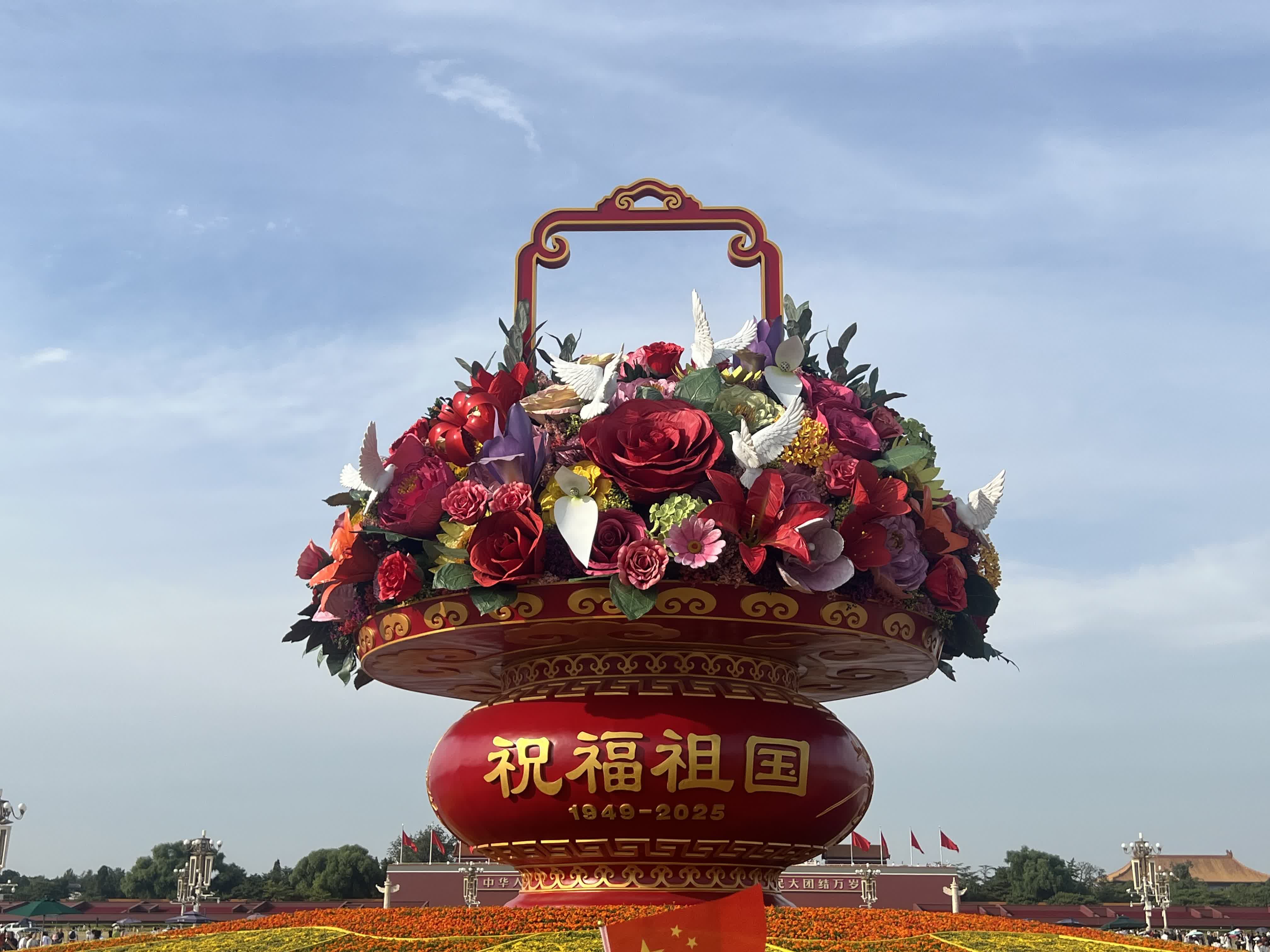「祝福祖國」花壇以喜慶的花籃為主景,花壇底部直徑45米,為向日葵圖案,寓意葵花朵朵向太陽。花壇頂高18米,籃體高16米,籃盤直徑12米。在籃體南側書寫「祝福祖國,1949—2025」字樣,在籃體北側書寫「歡度國慶,1949—2025」字樣。