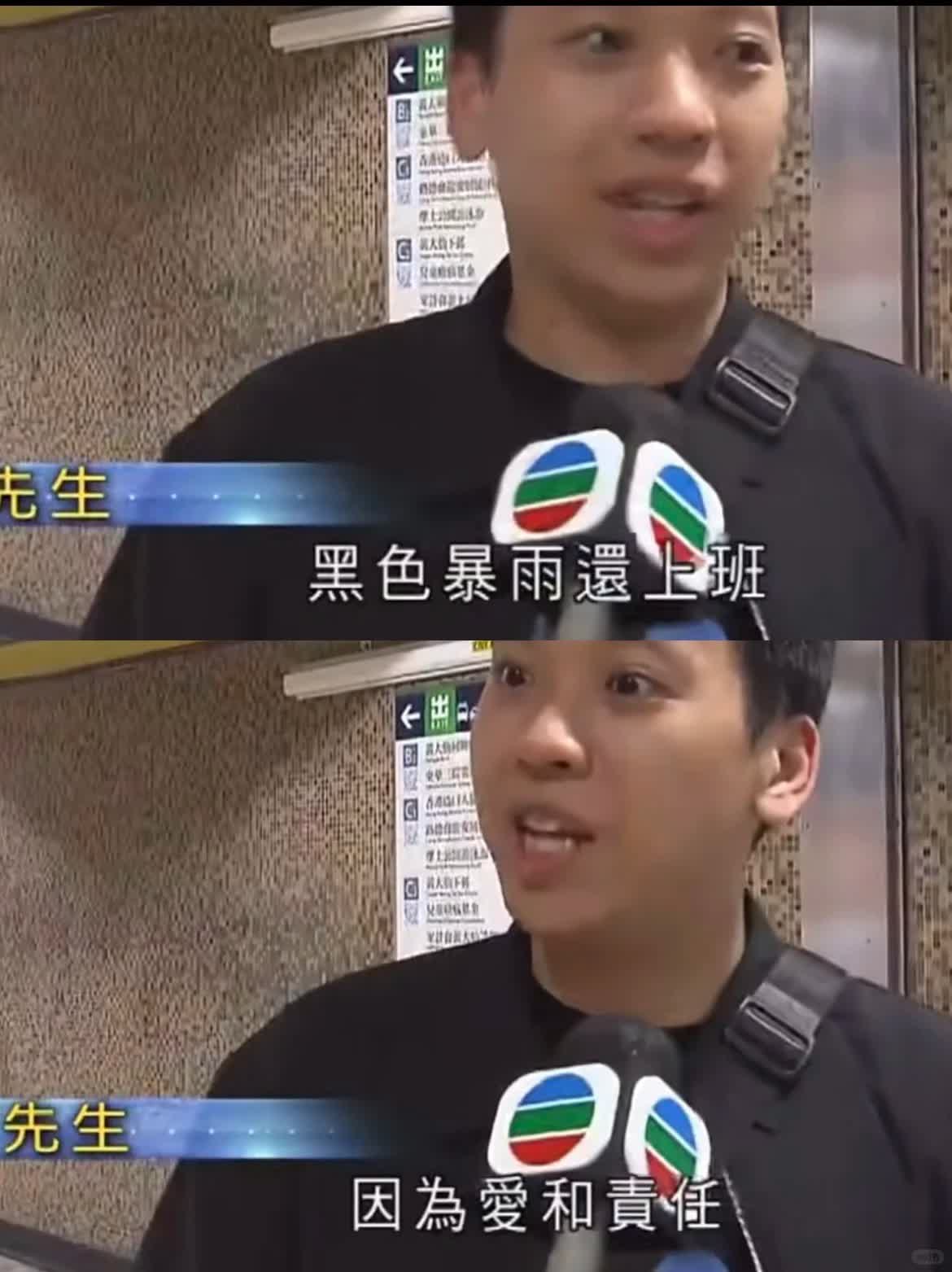 今年7~8月,香港17日內5度發黑雨警告,破年內發出黑雨歷史紀錄。市民黑雨無阻返工路火爆網絡:「因為愛與責任。」