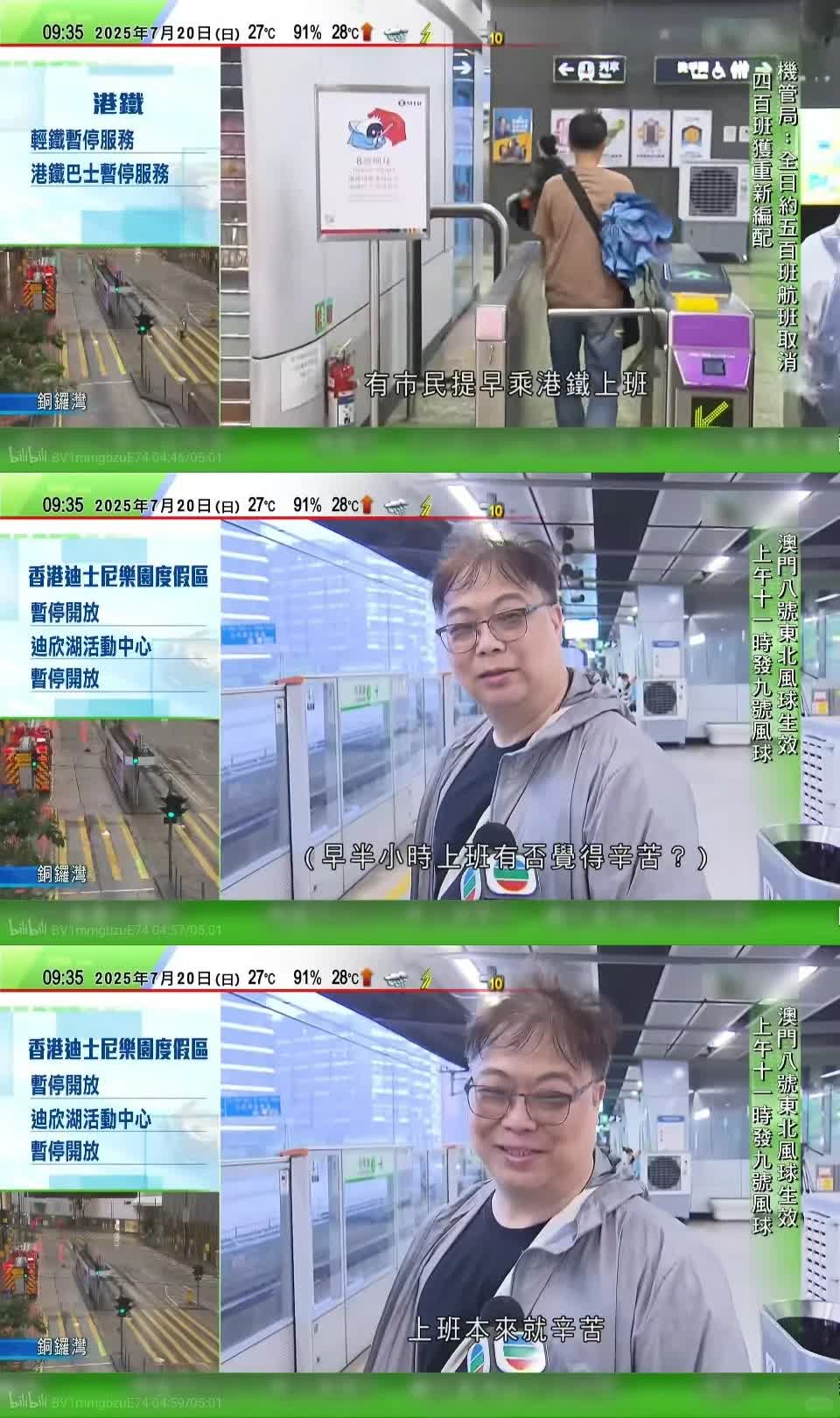 7月20日,颱風「韋帕」襲港,有市民提早乘搭港鐵上班,被問及「早半小時上班有否覺得辛苦」,市民表示「上班本來就辛苦」。