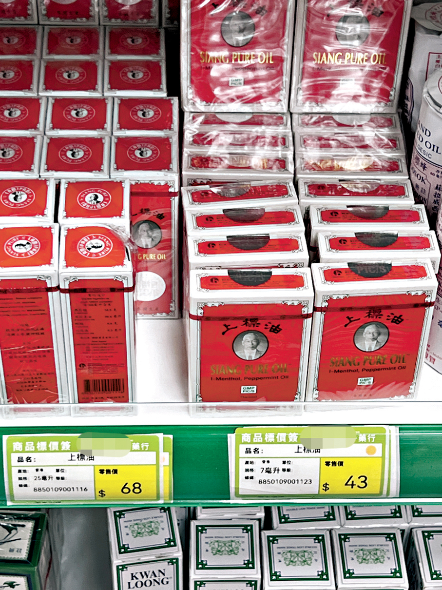 除了該兩款重點推銷的影射藥,記者還留意到,該店所售藥品多為影射藥,多數未獲註冊編號,例如馳名的「蜆殼胃散」變成「殼牌胃散」,「位元堂」被山寨成「復元堂」。櫃枱上還擺放疑似「正露丸」的影射藥,記者詢問它與正貨(手機相片)區別時,店員辯稱前者為香港版、後者屬日本版。而寥寥可數的正貨藥,如泰國上標油7毫升裝,一般藥房20元有找,此處則是海鮮價43元,變相利誘旅客購買定價較低的影射藥。
