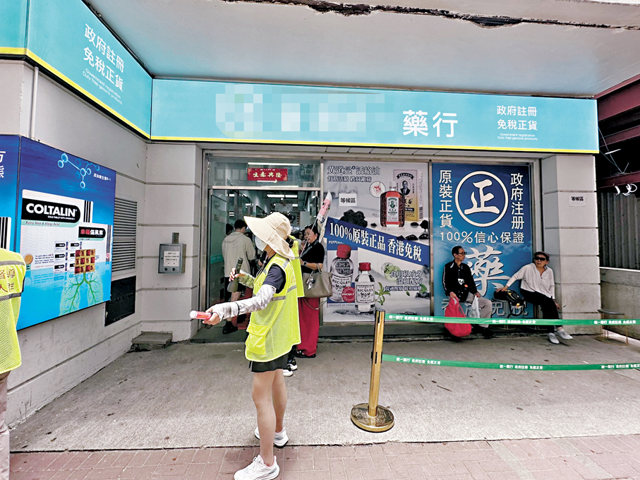記者甫落車,發現藥行設獨立出入口,實行單向流動,門外有數名穿熒光背心的職員維持秩序,並阻截非旅行團人員進入。當日正值假期後第一天,已非旅遊高峰期,但駐足該店旅客仍人頭湧湧。