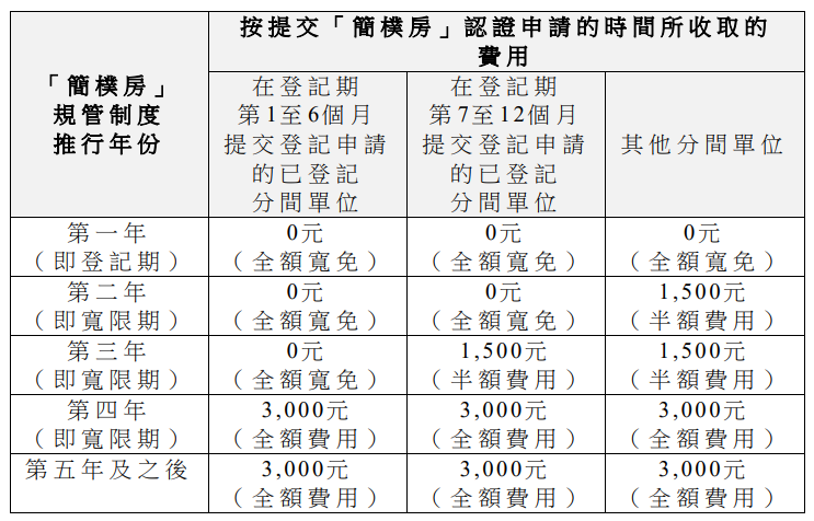 為推動市場盡早完成認證,《條例草案》首3年推出「早鳥優惠」。簡單而言,在登記期首半年(即2026年3月1日至2026年8月31日)期間登記的住宅單位可以獲首3年豁免「簡樸房」認證費用,由第四年開始就需要繳付全額費用3,000元。如果在登記期後半年(即2026年9月1日至2027年2月28日)期間登記寬限期申請的住宅單位,就可以獲首兩年豁免簡樸房認證費用,第三年會收取半額費用,第四年及後則收取全額費用。