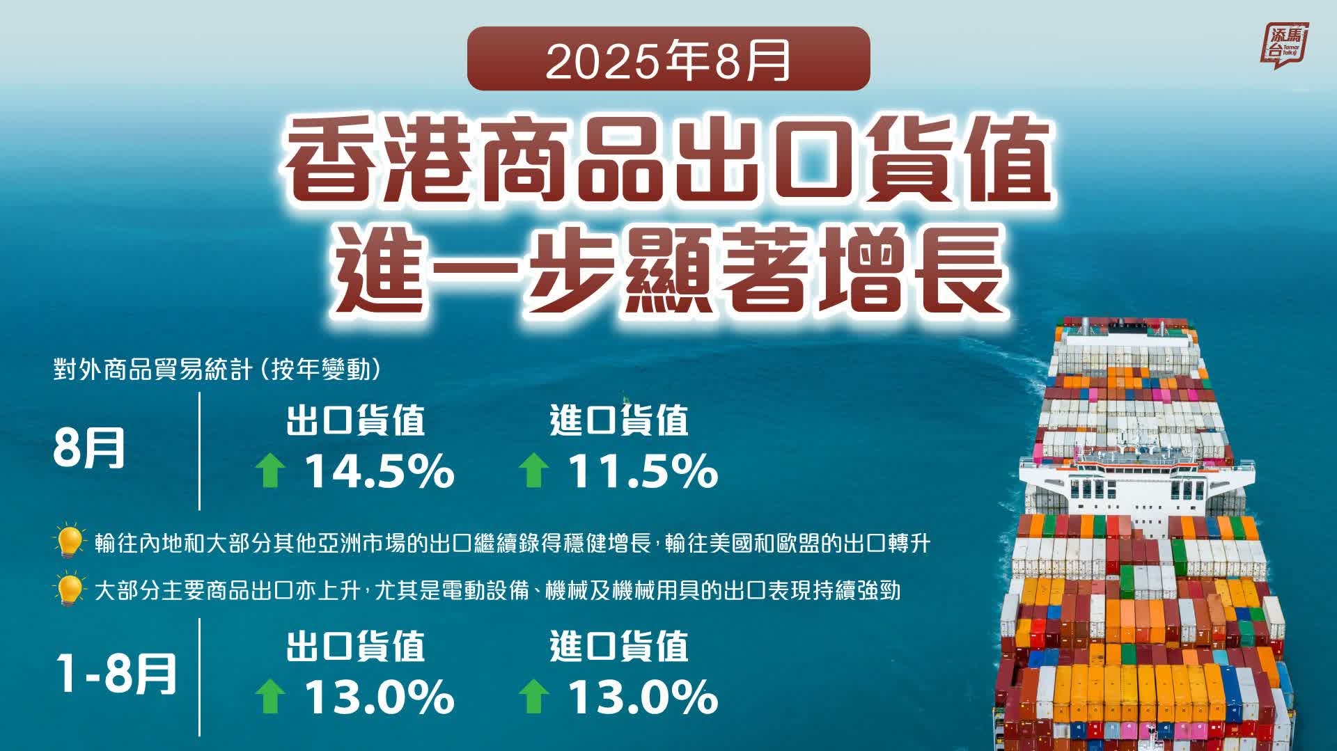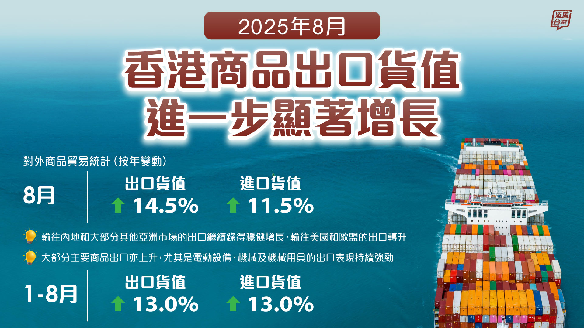 根據最新發表的對外商品貿易統計數字顯示,2025年8月份本港整體出口和進口貨值均錄得按年升幅,分別上升14.5%和11.5%。看圖了解更多。