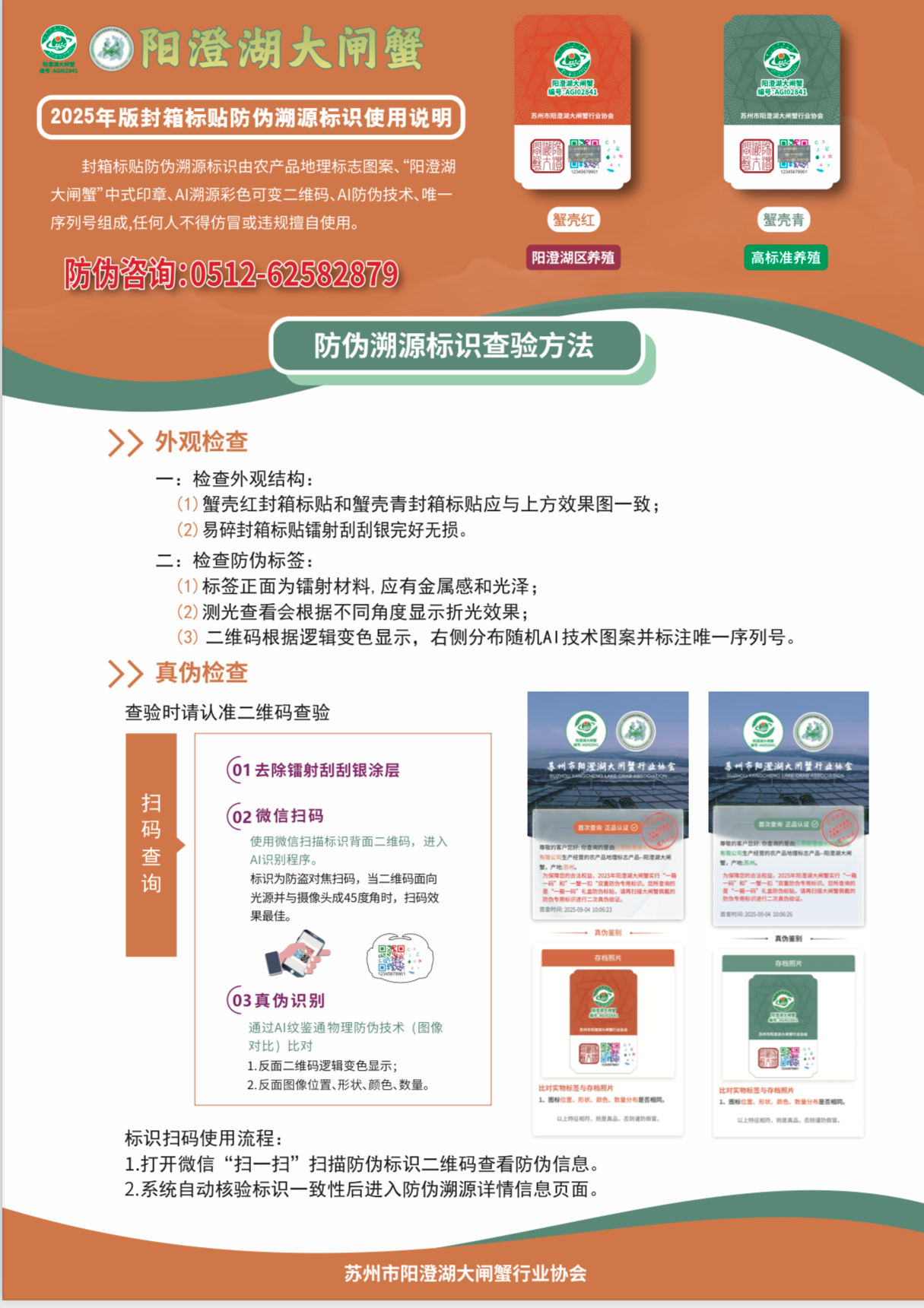 據蘇州市陽澄湖大閘蟹行業協會新聞辦主任姚水生介紹,新一代防偽標識在延續「一蟹一扣」的機制上,今年增加了「一箱一貼」的雙重防偽。湖區圍網養殖為「蟹殼紅」,高標準養殖為「蟹殼青」,標籤正面為鐳射材料,反面二維碼根據邏輯變色顯示。打開微信掃描防偽標識二維碼可查看防偽信息,系統自動核驗標識一致性後進入防偽溯源詳情信息頁面。從而構建起從養殖到餐桌的全程可追溯體系,為消費者提供更可靠的真品保障。