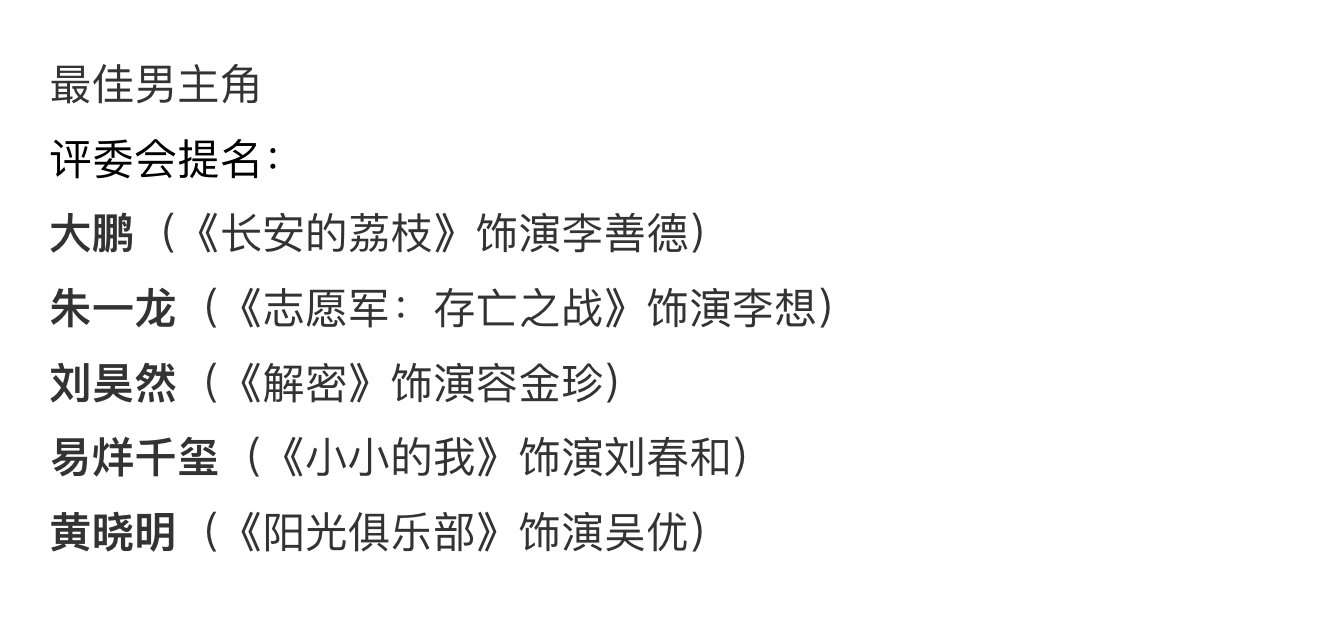 而最佳男主角之爭無疑是本屆頒獎禮的最大焦點,競爭已進入白熱化。朱一龍、易烊千璽兩位「頂流」均被提名。85後演員朱一龍二獲金雞獎提名,這也是其第二次與易烊千璽同台角逐影帝寶座。朱一龍在《志願軍:存亡之戰》中飾演李想,透過單一人物刻畫了志願軍光榮而悲壯的英雄歷史。