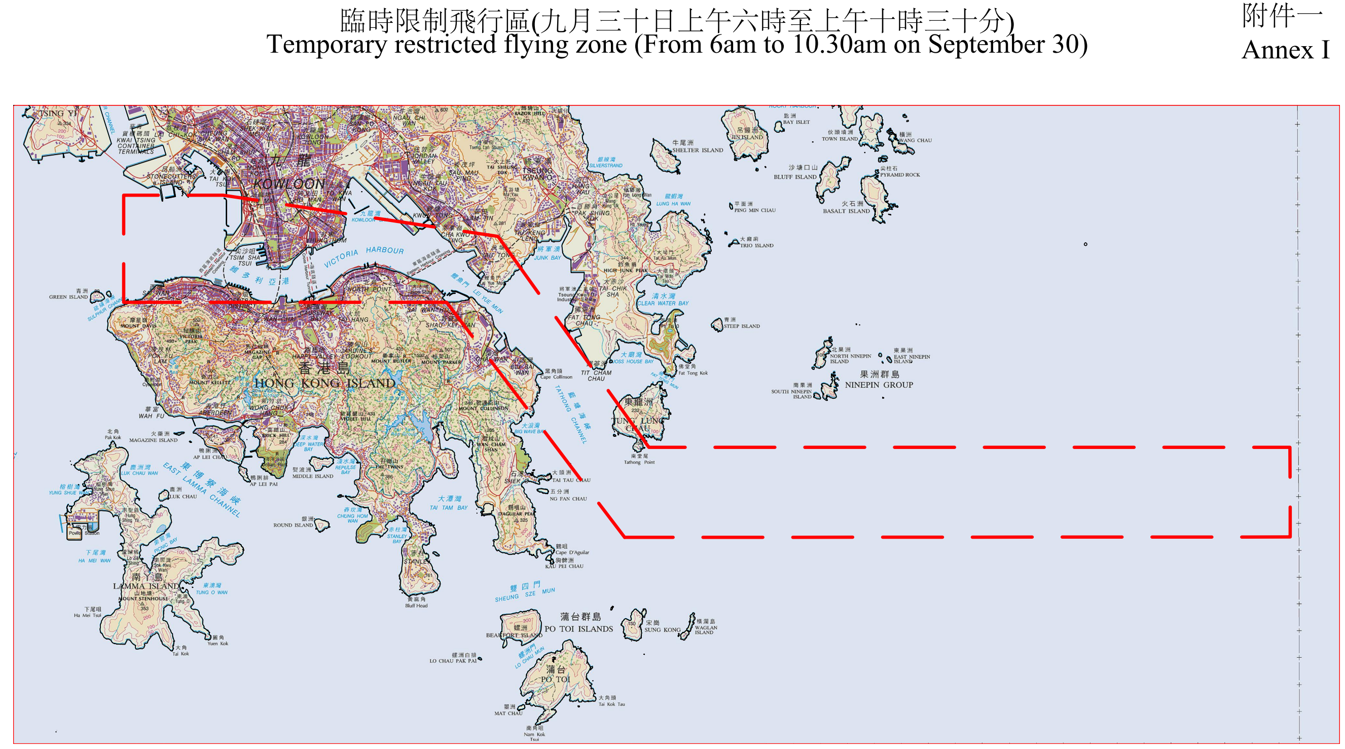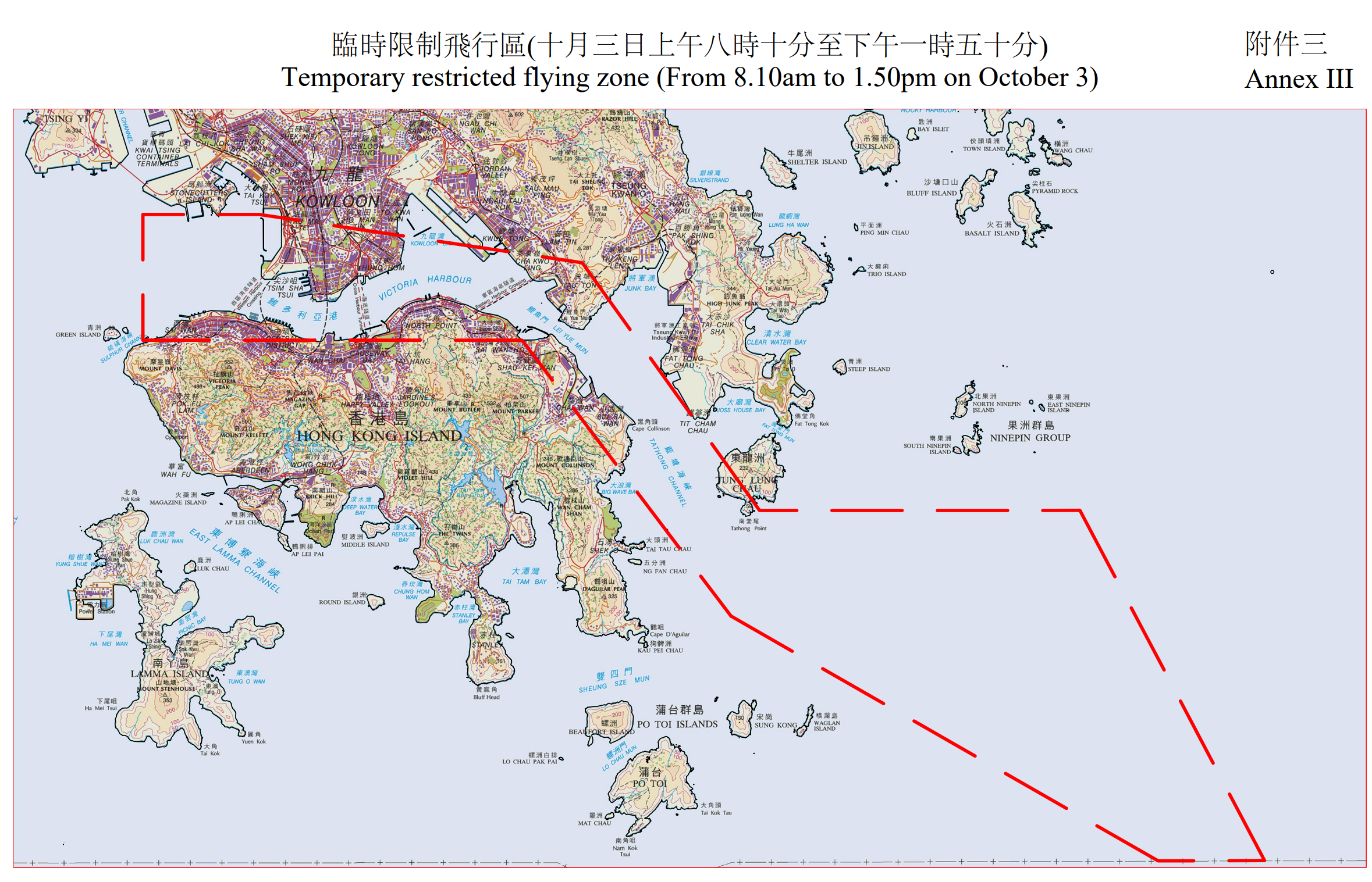 民航處發言人表示,為配合特別活動,民航處將在藍塘海峽、維多利亞港以及昂船洲一帶設立臨時限制飛行區,生效時間為9月30日至10月3日的若干時段。除政府飛行服務隊航機外,所有航空器均不得進入有關範圍。臨時限制飛行區亦限制所有其他類型的飛行活動,例如放飛模型飛機、飄放風箏,及放飛繫留氣球或大量氣球等。