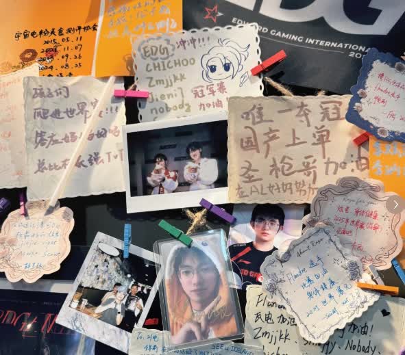 今年7月,EDG俱樂部門口的一家港式米線店面臨結業,那是李炫君過去常和隊友結伴吃宵夜的地方。剛在沙特打完電競世界盃回國的他聞訊便約上曾經的隊友故地重遊。臨走前,李炫君在小店留言墻上留下一張他與前隊友Viper的合照。自此,小店好似起死回生一般,無數EDG粉絲慕名前來,在墻上留言打卡。這家米線店不僅成為粉絲們的精神落腳點,也儲存了李炫君最美好的回憶之一,「對我來說,那是拿到世界冠軍的一部分,所以很喜歡。」餐桌旁的笑語,成為他與隊友共同的記憶。