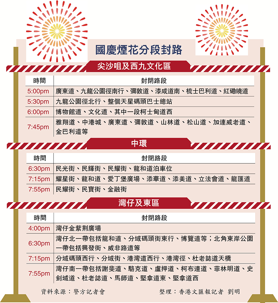 香港文匯報訊(記者 劉明)因應內地國慶黃金周大批旅客訪港,香港特區政府入境處減少前線人員休假,加開檢查櫃枱和通道疏導人流及車流。而因應國慶當日晚上8時維港上空有歷時23分鐘的國慶煙花匯演,預料會有大量巿民和旅客於海旁觀賞。警方將於當日下午5時起分階段在港島及九龍實施封路措施,附近一帶部分巴士站會暫停服務,海事處亦會執行海上交通管制。
