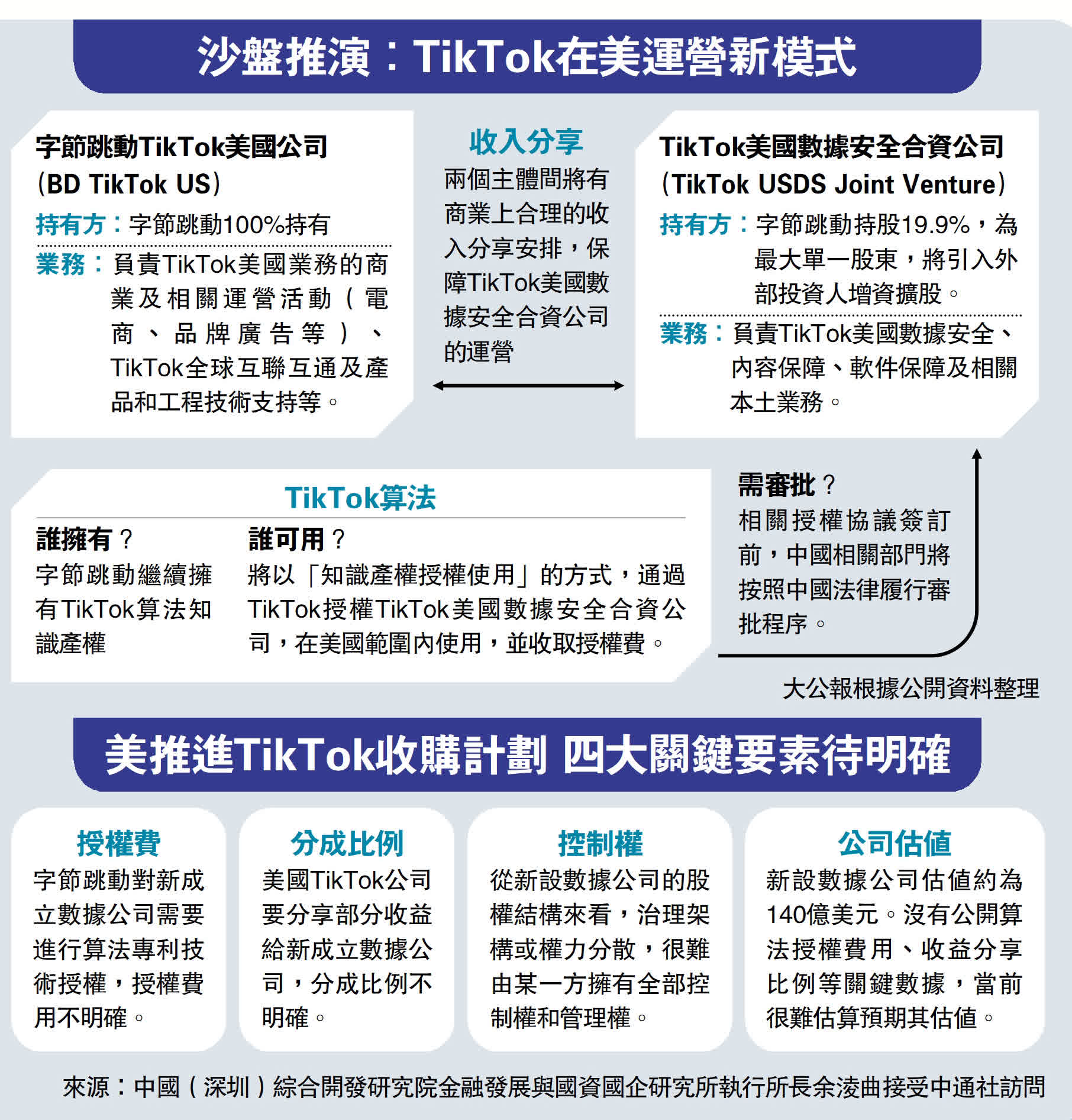 大公報綜合中新社、中通社、外電報道,美國總統特朗普當地時間25日簽署行政令,批准新版TikTok美國運營方案,推進美國投資者對TikTok在美業務的收購計劃。分析指出,從美方披露信息來看,不少交易關鍵要素尚未清晰:一,字節跳動對新成立數據公司需要進行算法專利技術授權,授權費用不明確;二,美國TikTok公司要分享部分收益給新成立數據公司,分成比例不明確。