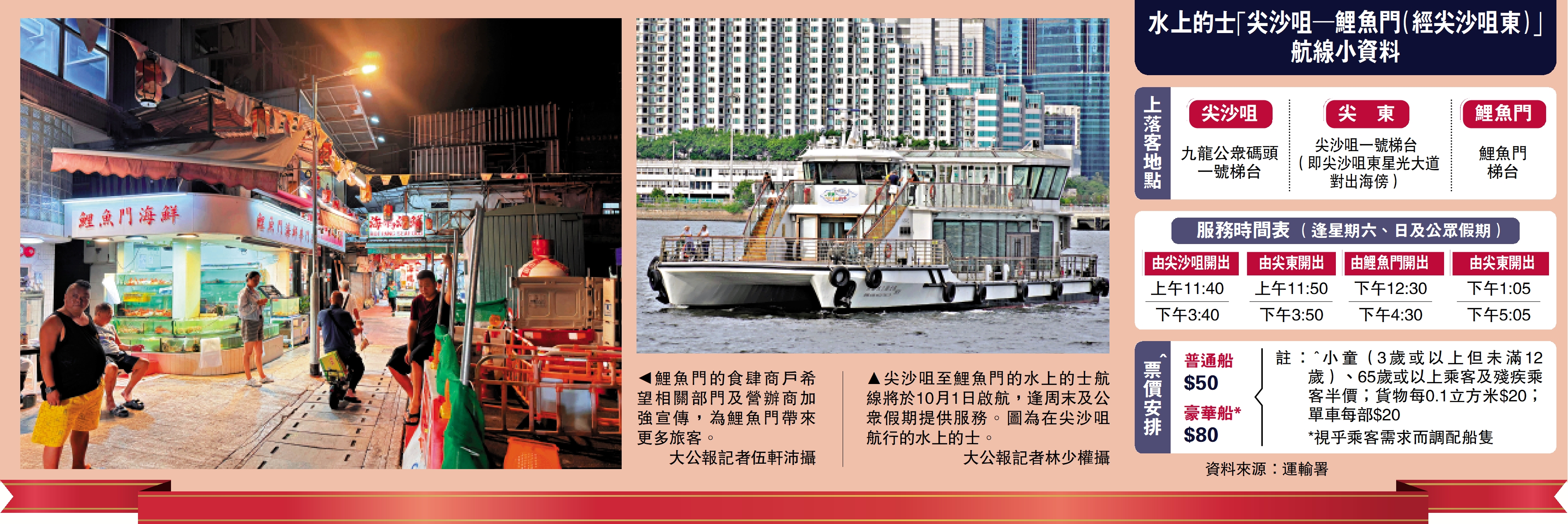 九龍東立法會議員顏汶羽向《大公報》表示,十一黃金周將至,鯉魚門經政府和旅遊業界改造後,有更多觀景點,新建的登岸設施令交通更方便,加上有新水上的士航線,即將開通,有望吸引更多旅客前往。