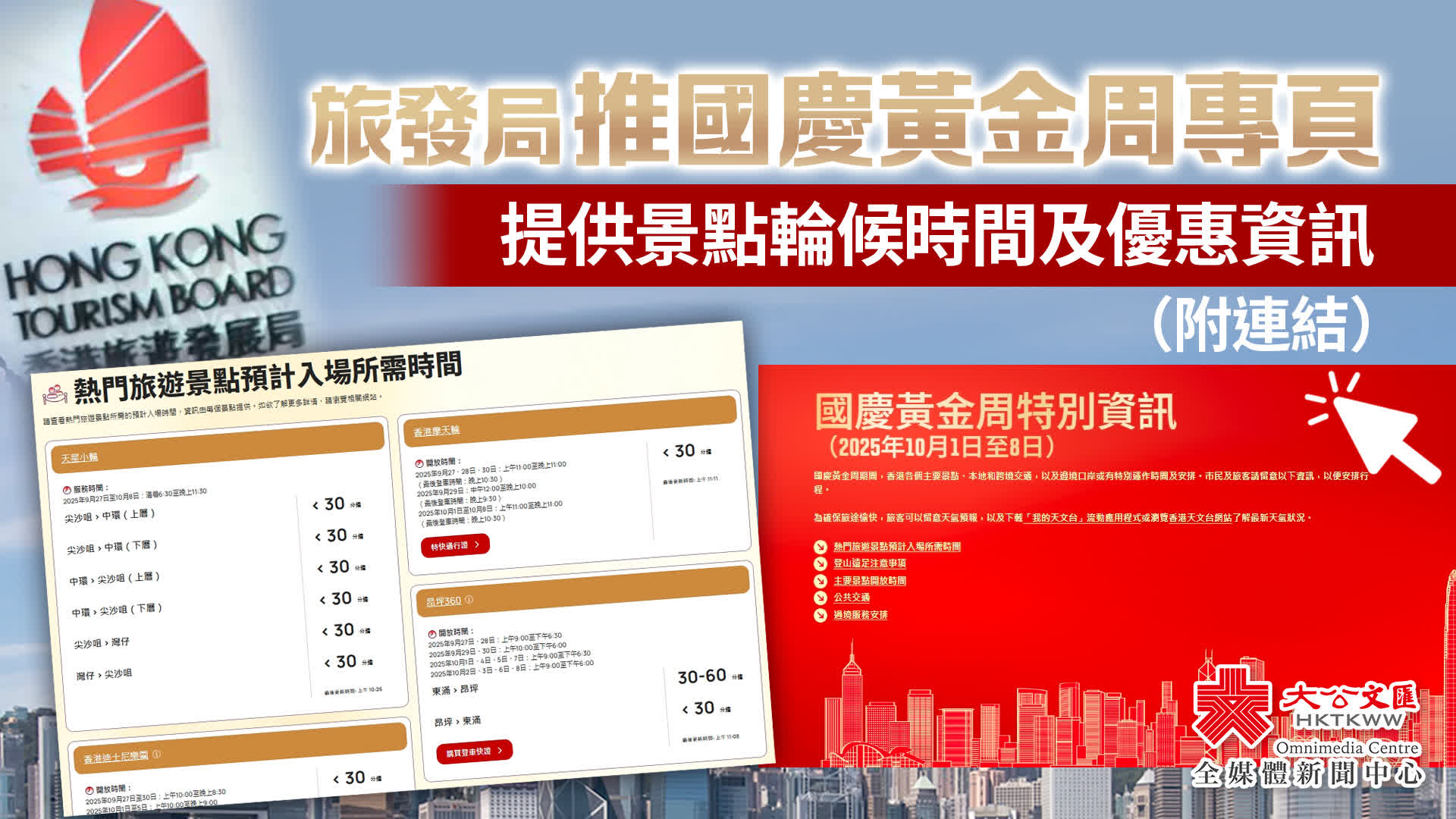 旅發局亦在內地加強宣傳,包括與業界聯手,透過社交媒體、直播、網絡達人及線上旅遊平台等,推廣多元化旅遊產品及優惠,涵蓋國慶旅遊產品、餐飲、零售及酒店等,吸引旅客訪港、延長逗留時間及促進消費。