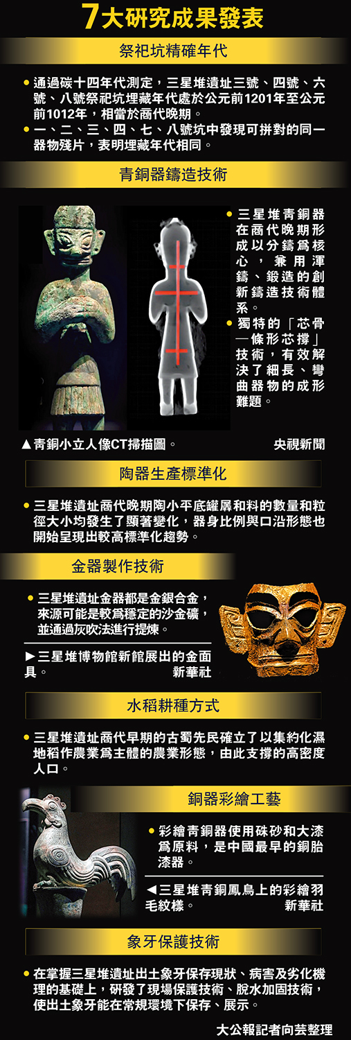 (大公報記者 向芸)9月27日,以「考古學視野下的文明互鑒」為主題的2025三星堆論壇在四川省德陽市開幕。現場發布了三星堆遺址考古多學科研究的七大新進展。其中,通過碳十四年代測定,三星堆祭祀坑埋藏年代為商代晚期。