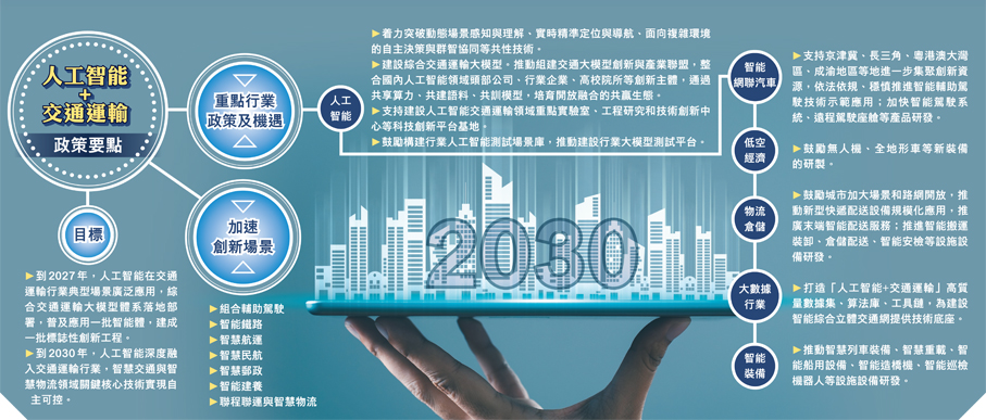 (香港文匯報記者 郭瀚林)響應國家人工智能(AI)戰略,交通運輸將成為AI+重要試驗場。交通運輸部等七部門上周五聯合印發《關於「人工智能+交通運輸」的實施意見》提出,目標到2027年,人工智能在交通運輸行業典型場景廣泛應用,綜合交通運輸大模型體系落地,建成一批「人工智能+交通運輸」標誌性創新工程。文件部署建設綜合交通運輸大模型等16項具體任務,推動人工智能在交通運輸領域規模化創新應用,加快智能駕駛系統、遠程駕駛座艙等產品研發。專家表示,未來三至五年人工智能在內地交通運輸領域有望系統性全面推進和落地應用,不僅有利於提高全社會經濟效率,並將為智慧交通產業帶來新一輪發展機遇,行業預測,到2027年中國智慧交通市場規模有望突破萬億元(人民幣,下同)。