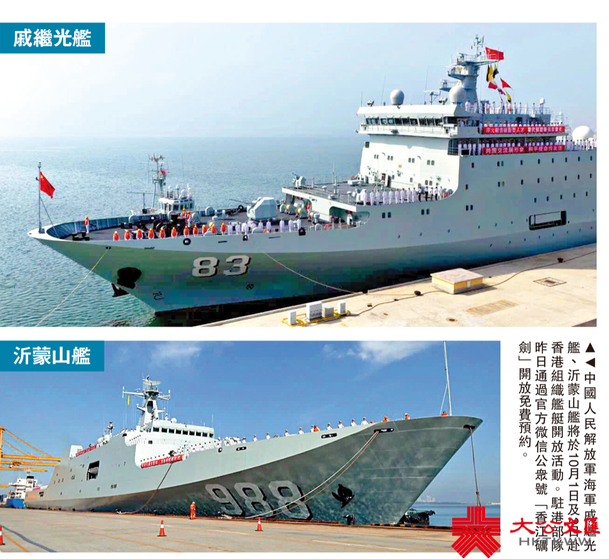海軍戚繼光艦(舷號83)是我國自主設計建造的大型海軍訓練艦,滿載排水量約9000餘噸,是海軍噸位最大現代化水平最高的專業訓練艦。而海軍沂蒙山艦(舷號988)屬071型船塢登陸艦,正常排水量約19000餘噸,具有噸位大、裝載能力強續航里程遠等突出特點。可擔負快速、立體、機動登陸作戰,可執行輸送救災物資,提供醫療救援等使命任務。