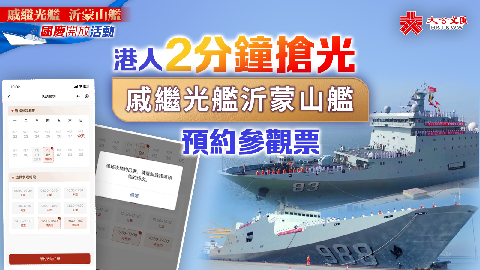 (大公報記者龔學鳴、古倬勳報道)中國人民解放軍海軍戚繼光艦、沂蒙山艦於9月底執行遠海實習任務,其間,將於10月1日及2日赴香港組織艦艇開放活動。11000張門票於27日起每日分三個時間段開啟預約通道,記者親歷預約流程,名額非常搶手,門票開搶2分鐘內各時段門票就全部顯示已約滿。