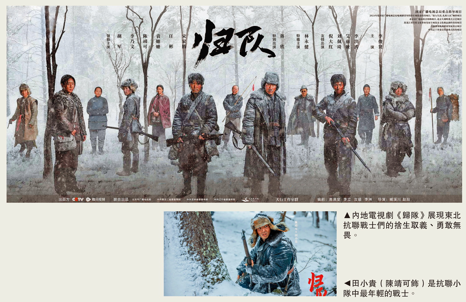 當九三大閱兵上的戰旗方陣中「楊靖宇支隊」的戰旗出現在眼前時,場內外的觀眾都沸騰了。先輩們為了抗戰勝利拋頭顱灑熱血,其中東北地區在抗擊日寇的鬥爭中,作出了不可磨滅的貢獻。近期在內地播畢的主旋律電視劇《歸隊》即聚焦「東北抗聯」的血淚抗爭歷程,把戰士們的捨生取義、勇敢無畏展現得淋漓盡致,以創新的敘事手法,講述發生在東北這片土地上的崢嶸故事。