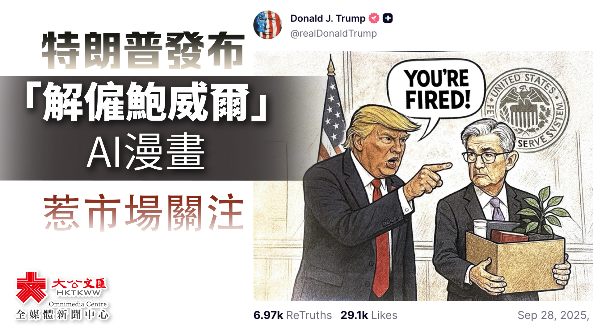 大公文匯全媒體報道,美國總統特朗普在當地時間周六在社交平台上發布了一幅疑似由AI生成的「解僱聯儲局主席鮑威爾」漫畫,再度引發華爾街關注。正常情況下,鮑威爾任期到2026年5月。
