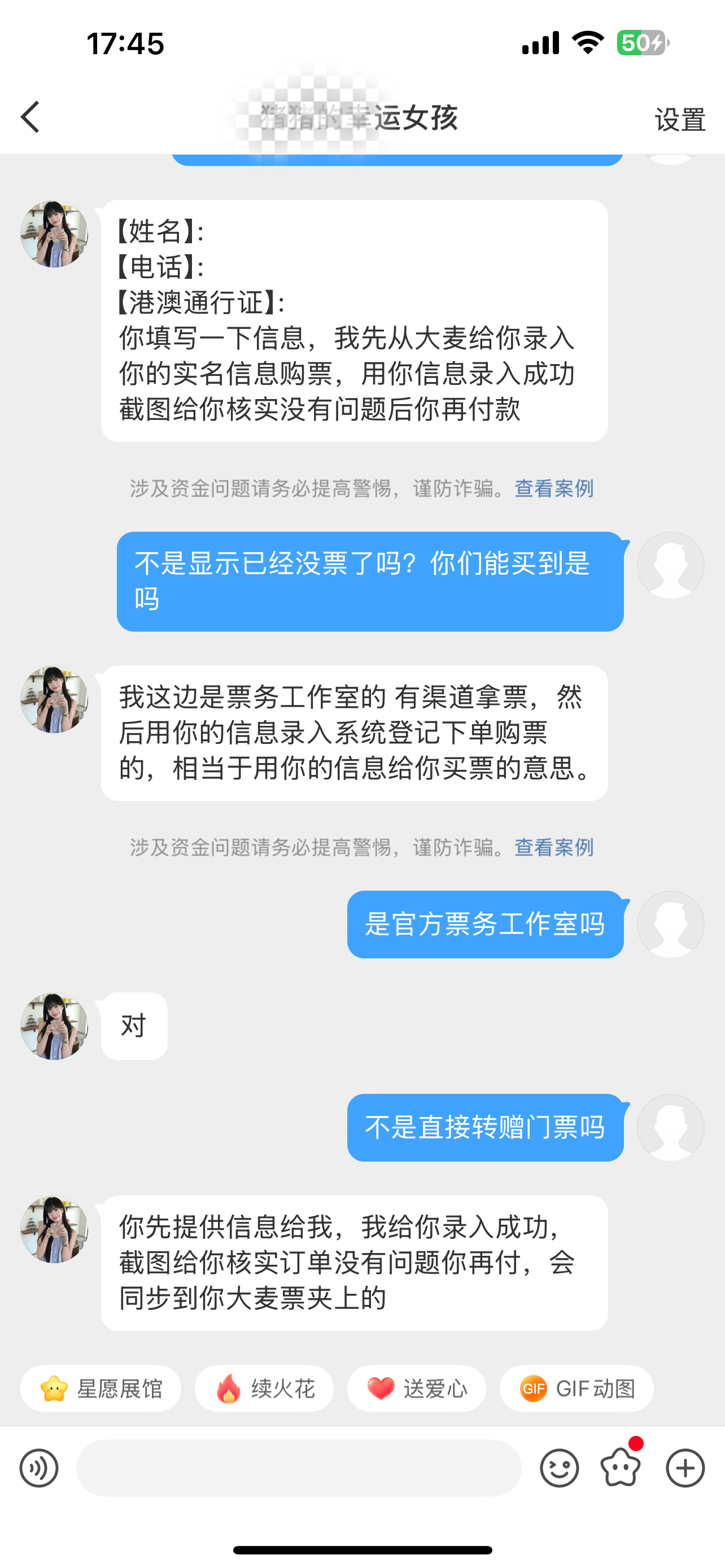 記者以觀眾身份向一名兜售門票的女子購買11月15日或16日的比賽門票,儘管官方渠道已顯示無票,但她表示自己來自「官方票務工作室」,有渠道拿票,並提出三個票檔的銷售價格,分別是200元、500元、800元。對比官方票價100元、200元、300元,各票檔價格均多出1倍以上。當記者表達購票誠意後,該女子要求記者提供姓名、手機號及港澳通行證號碼。她表示,提供信息後,將在某購票網站錄入記者的實名信息進行購票,隨後會發送下單購票待付款的截圖頁面。