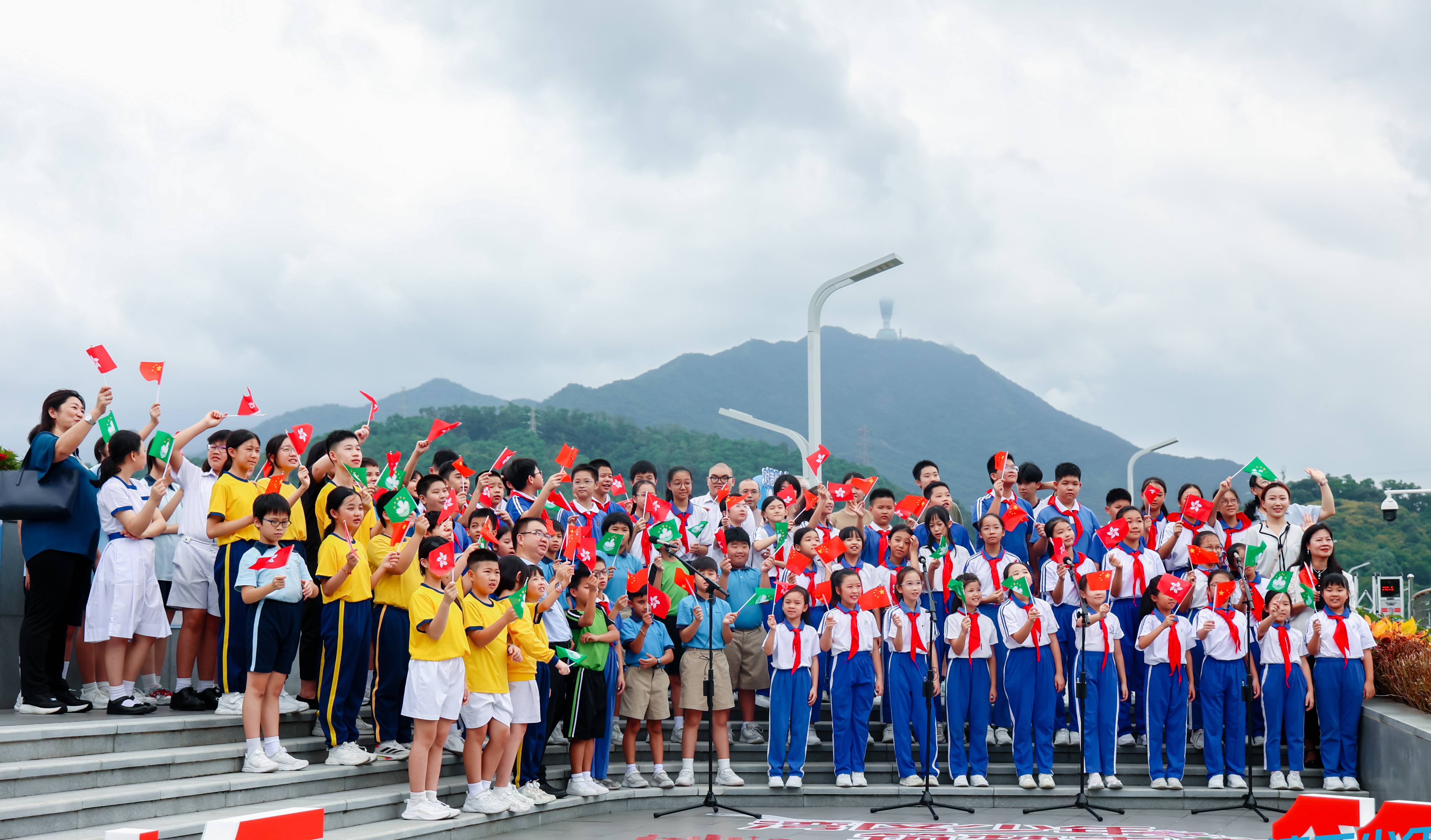 「我和我的祖國......」隨着主持人指令,三地青少年手持國旗和香港、澳門區旗,在音樂教師的指揮下齊聲歌唱。當唱到「我和我的祖國,一刻也不能分割」時,40名香港青少年自發用粵語加入合唱,形成「普通話+粵語」的雙聲部效果。合唱結束後,深港青少年在「愛國心愿牆」上貼下便簽。