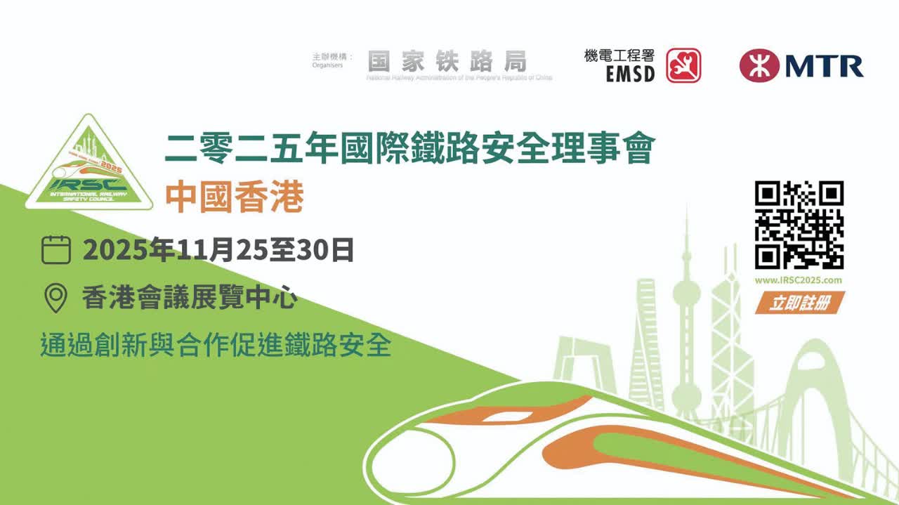 2025年國際鐵路安全理事會年度會議(IRSC 2025)將於11月25日至30日在香港會議展覽中心舉行,由國家鐵路局、機電工程署及港鐵公司聯合主辦,香港工程師學會為合作伙伴。香港特別行政區行政長官、國家鐵路局領導及港鐵公司主席將於11月26日主持開幕儀式。