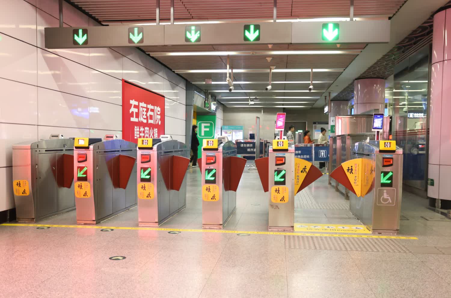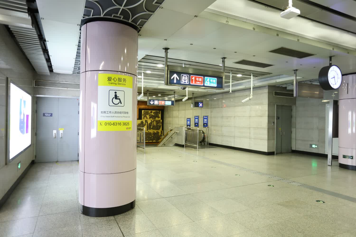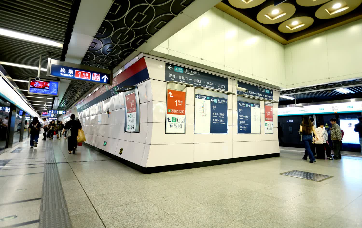 4號線西單站作為與1號線的換乘站,換乘客流較大。此次升級重點強化換乘路徑指引,在站台、站廳、換乘通道等關鍵位置,通過燈箱、牆貼等組合式標誌,清晰指引前往1號線的方向。此外,在西單站站台門上方新增「下一站」信息提示,便於乘客快速確認列車運行方向,減少誤乘情況的發生;在站台門張貼列車時刻表二維碼,方便乘客隨時查詢列車信息,合理安排出行。
