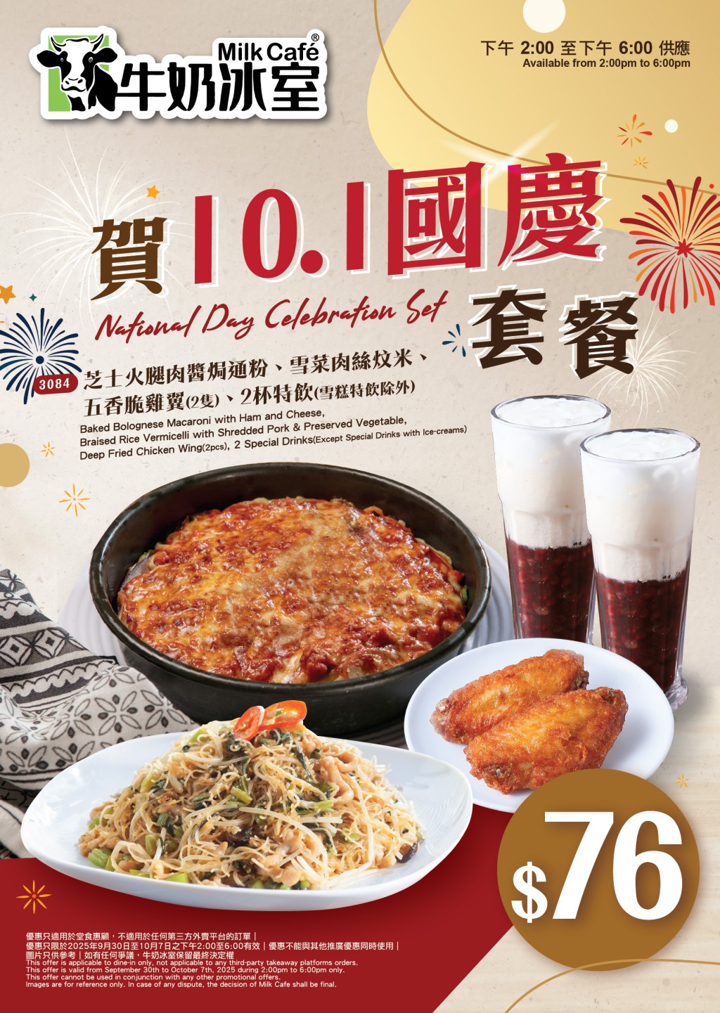 限時特價餐品:肯德基「家鄉雞/香辣脆雞/狂惹香燒雞$10一件」、我杯茶「雙黃鴛鴦菠蘿包+熱奶茶$37、黯然銷魂飯+熱奶茶$50」、東海堂「喵·紅豆銅鑼燒$10.1」、牛奶冰室/米籽/百份百餐廳/Chicken Factory「賀國慶套餐$76」……