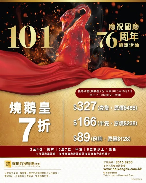 大公文匯全媒體報道,為慶祝中華人民共和國成立76周年,超過1000間食肆及商户將於10月1日提供菜式及餐飲優惠。香港飲食界今日(29日)公布「飲食界慶祝國慶76周年優惠活動」安排詳情,KFC再推「10蚊雞」,東海堂紅豆銅鑼燒盛惠$10.1,翡翠拉麵小籠包招牌「蟹粉小籠包」可享七折優惠。有連鎖餐廳推出品種多樣的港幣76元賀國慶套餐,更有本地餐飲集團旗下16個品牌齊出全日堂食七折優惠!而早前遭超強颱風「樺加沙」吹爆玻璃的香港富麗敦海洋公園酒店,今次及時返場推出自助午餐及晚餐國慶七折優惠,與食客共賀國慶。