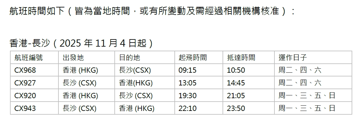 國泰航空往來香港與長沙的航班將採用空中巴士A321neo客機營運,配備商務及經濟客艙,以及屢獲殊榮的機上娛樂體驗。2025年至今,國泰集團已開通或宣布21個新客運航點。長沙是國泰集團今年在內地新增的第五個目的地。此前,國泰航空已於4月開通烏魯木齊航線,而香港快運亦於5月開設常州和義烏航線,並在7月首航飛往貴陽。