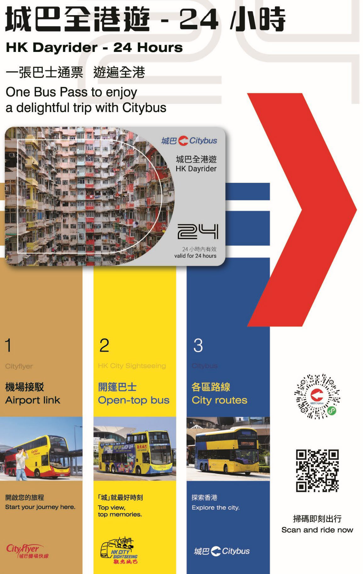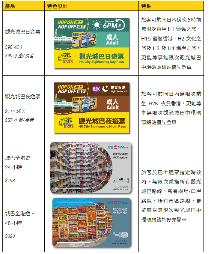 為了豐富旅客觀光體驗,城巴特意在國慶日前夕推出全新「觀光城巴日遊票」,旨在將深受旅客歡迎的香港開篷巴士遊提升至另一層次。旅客只需以港幣98元即可購買「觀光城巴日遊票」,無限次任搭城巴所有開篷巴士日間路線,由上午至傍晚6時,隨上隨落「H1懷舊之旅」、「H1S藝遊香港」、「H2文化之旅」及「H3及H4海岸之旅」路線,以全新角度探索港九自然景觀、文化藝術及海岸秘境。