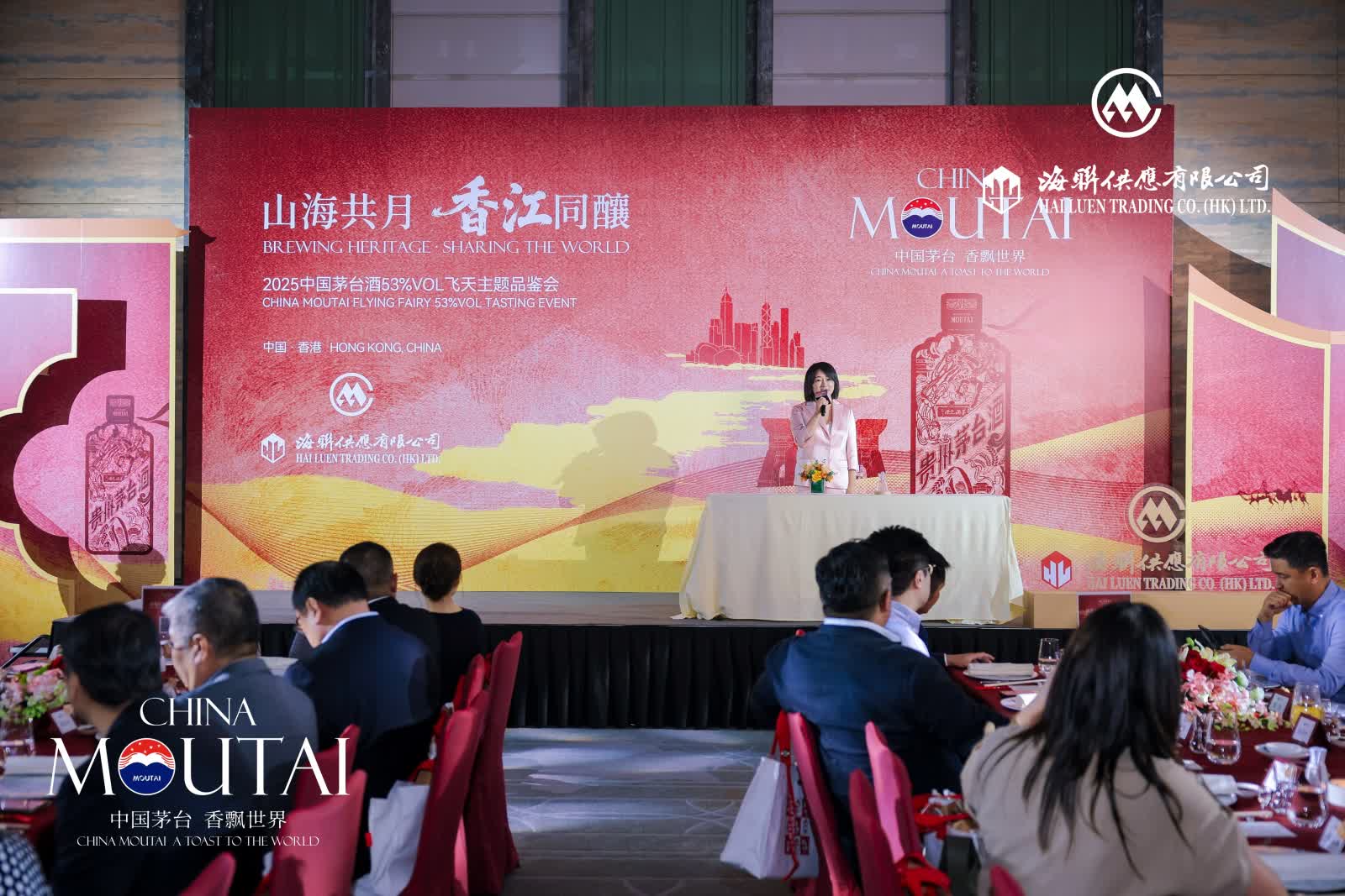 香江風暖,月色朗照。9月26日,由海聯供應有限公司(以下簡稱「香港海聯」)主辦的「山海共月 香江同釀」貴州茅台酒(53度飛天)品鑒宴在香港瑞吉酒店成功舉辦。香港海聯總經理劉為民先生、副總經理徐堃先生、張琦先生及海聯團隊、香港及內地政商界知名人士、重要渠道代表等百餘人出席,在香江月夜中品味茅台底蘊,探討中華酒文化的傳承與創新。