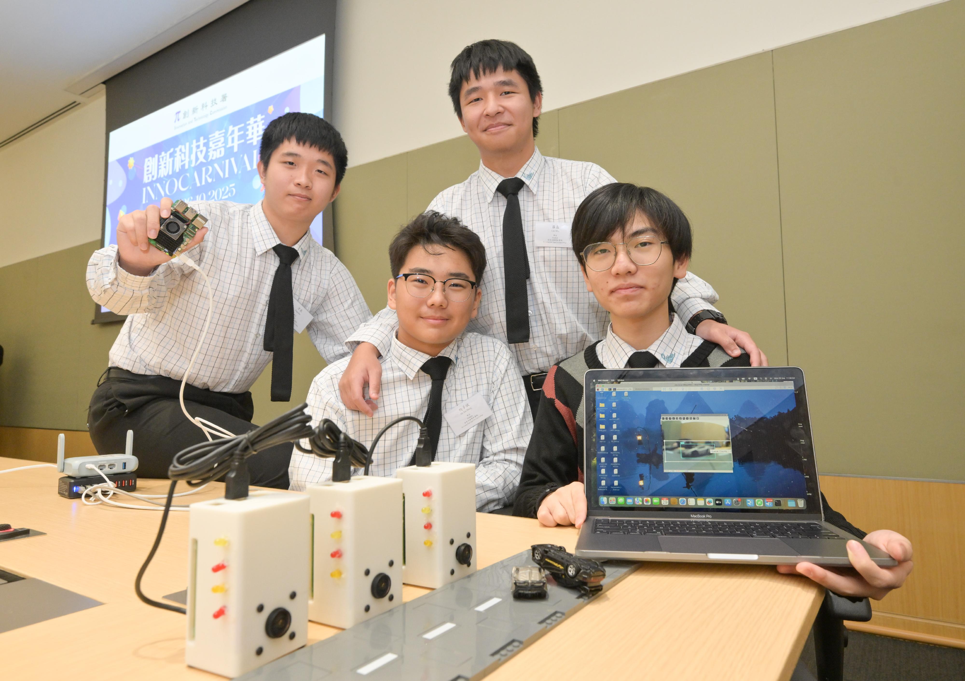此外,保良局顏寶鈴書院的團隊介紹了「智能路燈」系統。透過人工智能視覺識別技術,系統能在偵測到交通異常時發出閃光警示。事故地點附近的燈柱會以更高頻率閃爍,而較遠的燈柱則會降低閃爍頻率,藉此強化即時事故預警效能,提升道路安全水平。