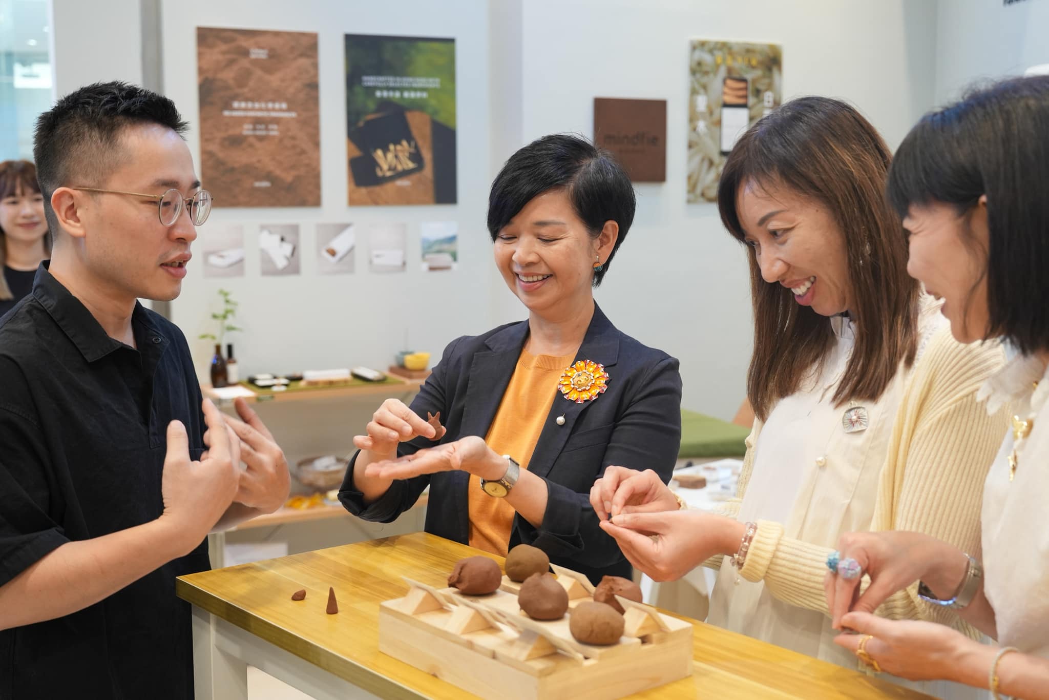 當日,何永賢先到售賣手工香產品的「Mindfie Goods」,她表示,店舖的兩位年輕人對製香有自己深入的了解,以往做廣告相關工作的他們,將宣傳的功力全部灌注在創業計劃上。何永賢現場還嘗試製作手工塔香,稱過程相當有趣,其間一直聞到舒適的香氣,絕對貼合現時不少人的生活追求。