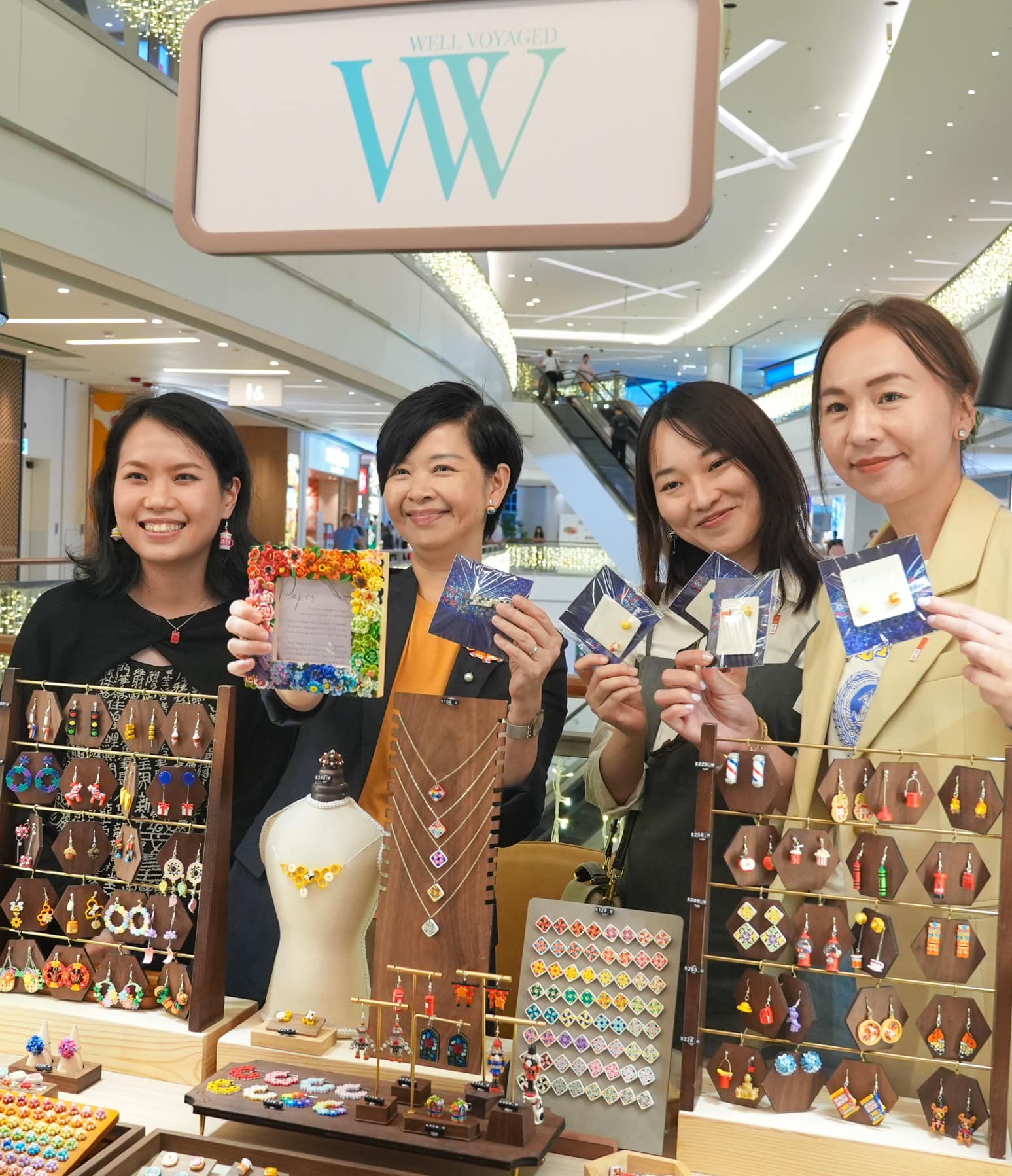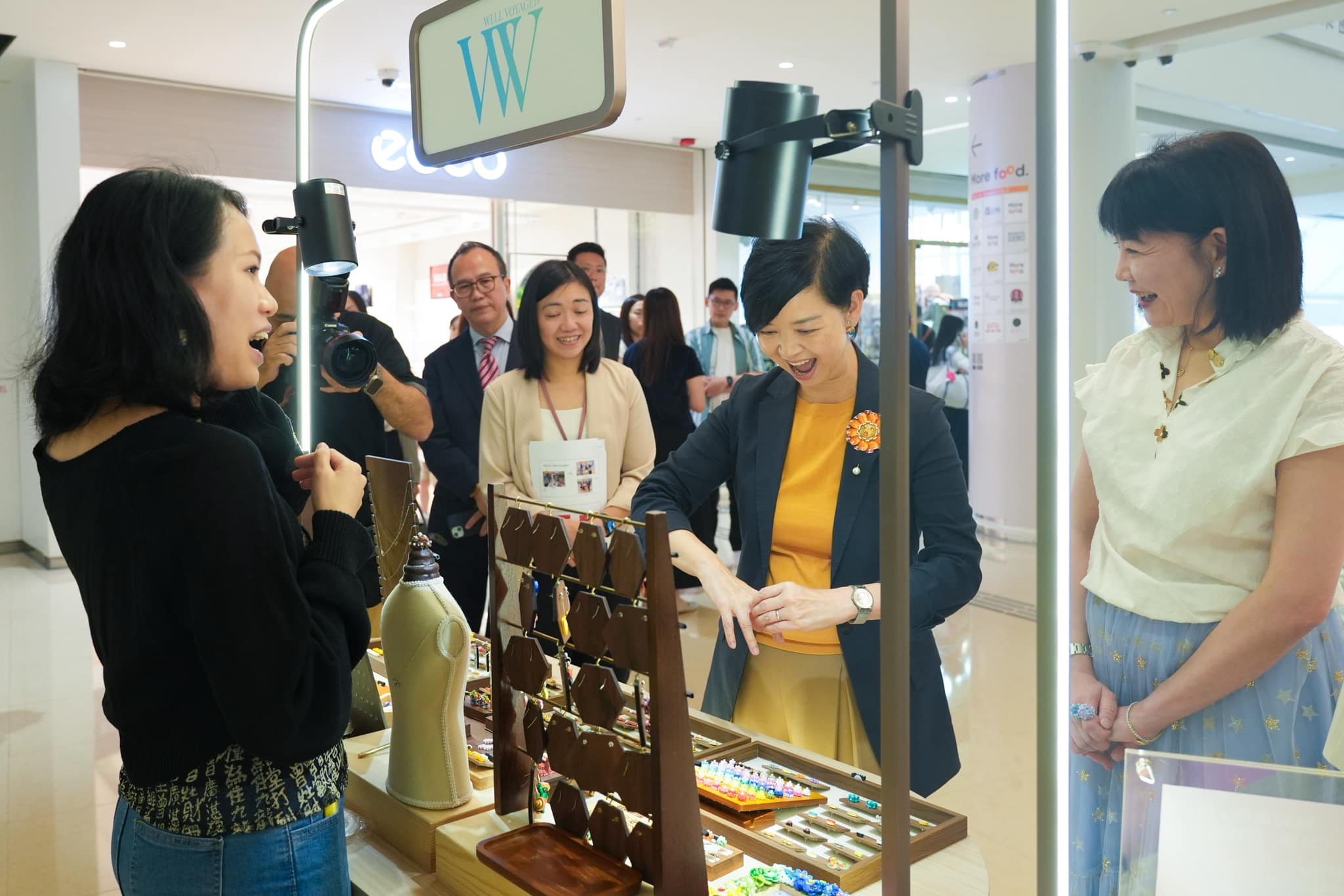 其後,何永賢一行人去了一個快閃店檔攤,看「Well Voyaged」的紙藝飾品,指出店主捲紙捲出不同香港特色,精緻非常。何永賢在現場選購了相框、髮夾、花花耳環等,亦特意選了八爪魚耳環送給另一位女局長。何永賢更現場親自試捲「菠蘿包」,坦言確實要很巧手。