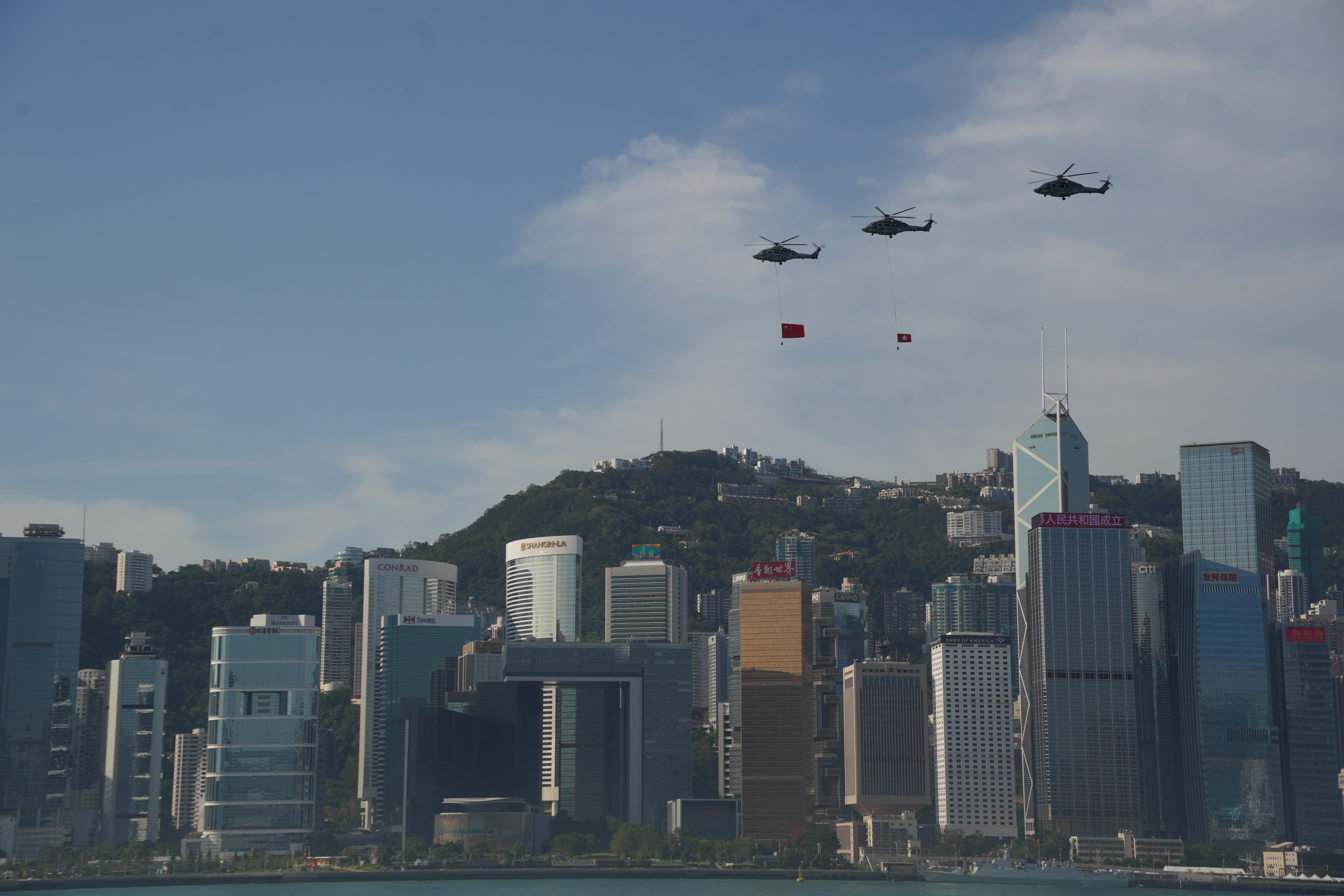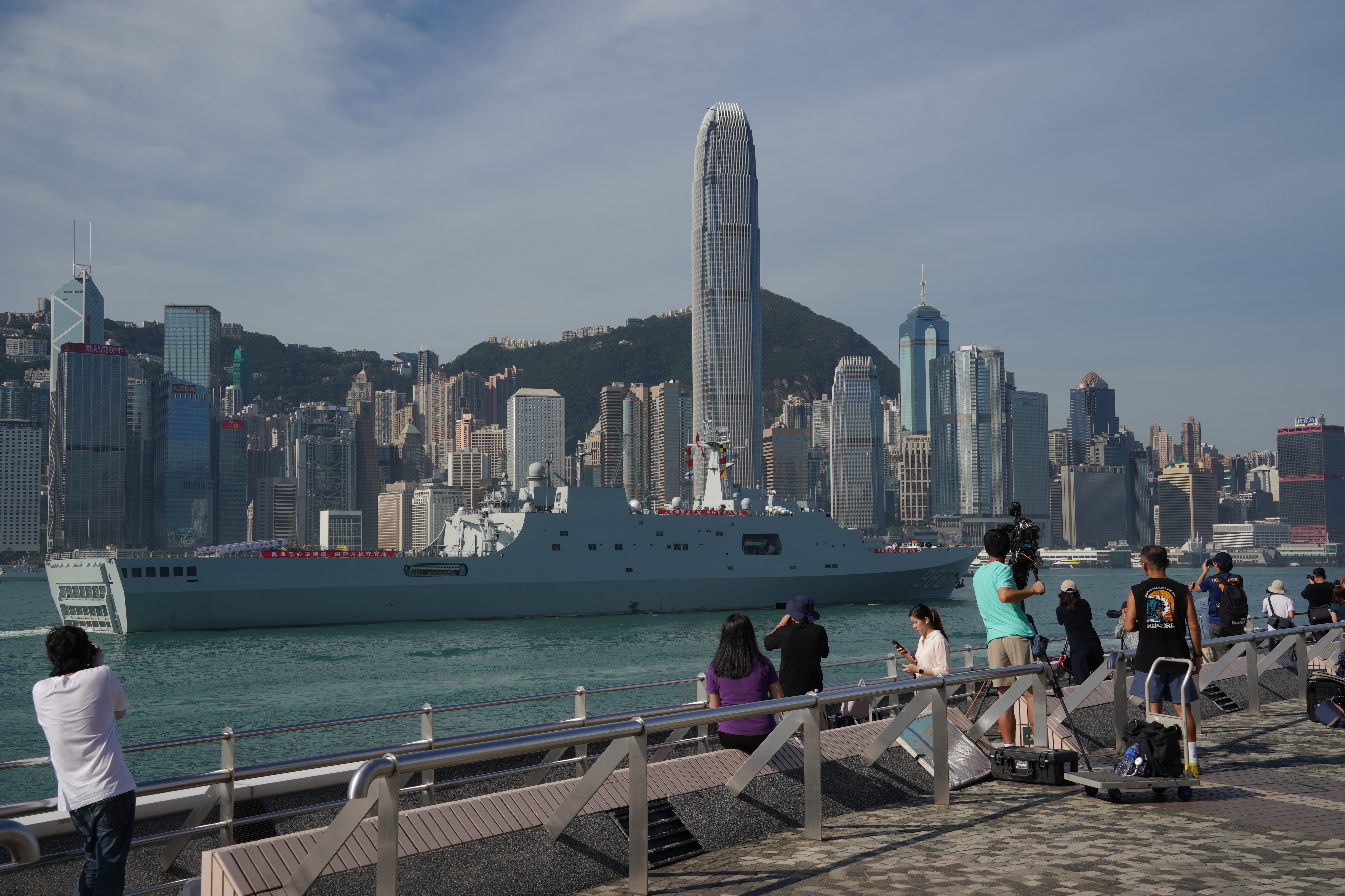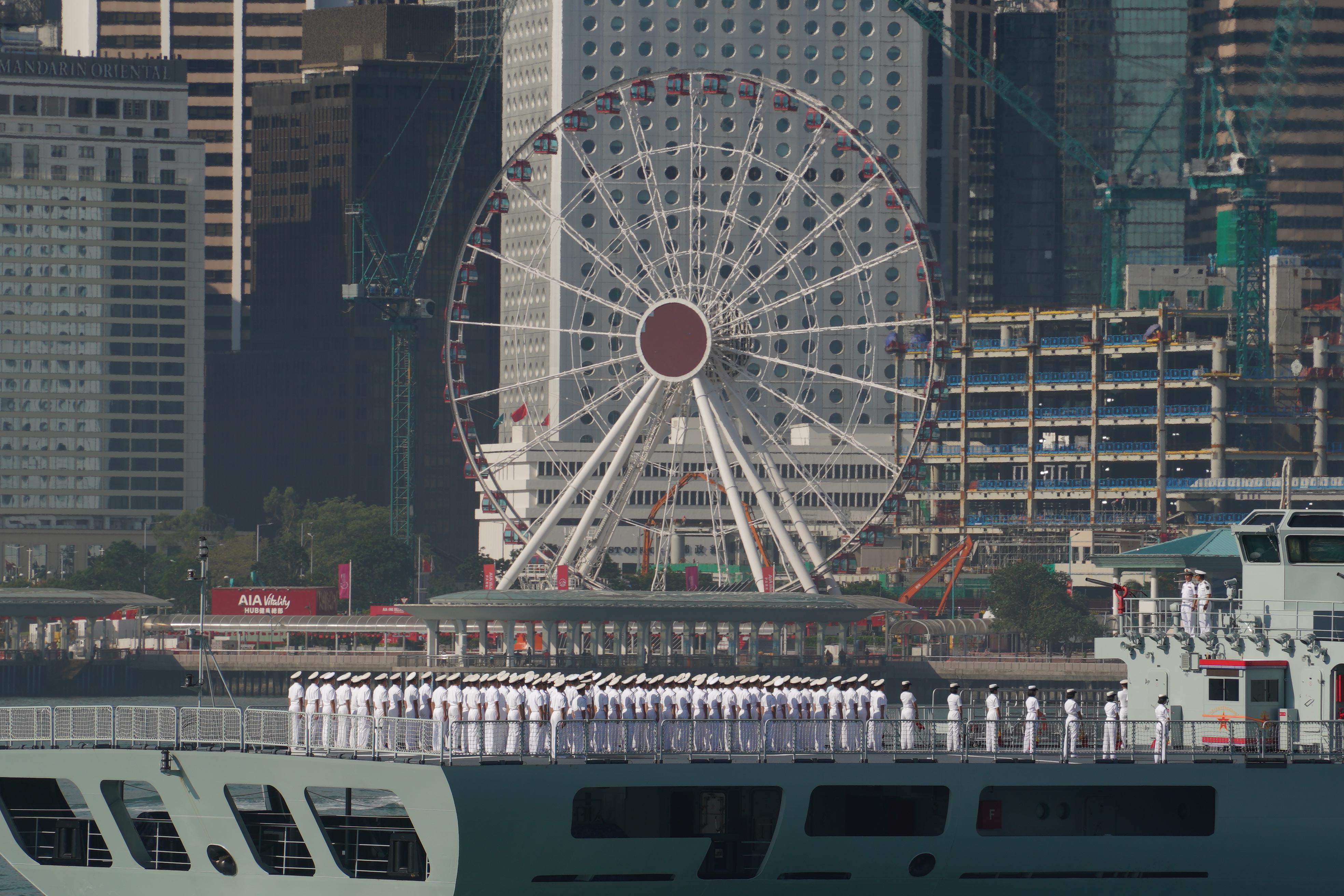 軍艦駛過維多利亞港,留下了軍艦與中環摩天輪同框等畫面;戚繼光艦上,有「向海圖強擔使命 愛民護港踐初心」「強軍逐夢向深藍 魚水情深滿香江」的橫幅;軍艦上,亦有英姿颯爽、氣宇軒昂的海軍,站姿筆直如松;還有不少遊客、市民藉此機會「打卡」,與軍艦合影。此外,在維多利亞港上空,有直升機懸掛五星紅旗和紫荊花旗飛過。