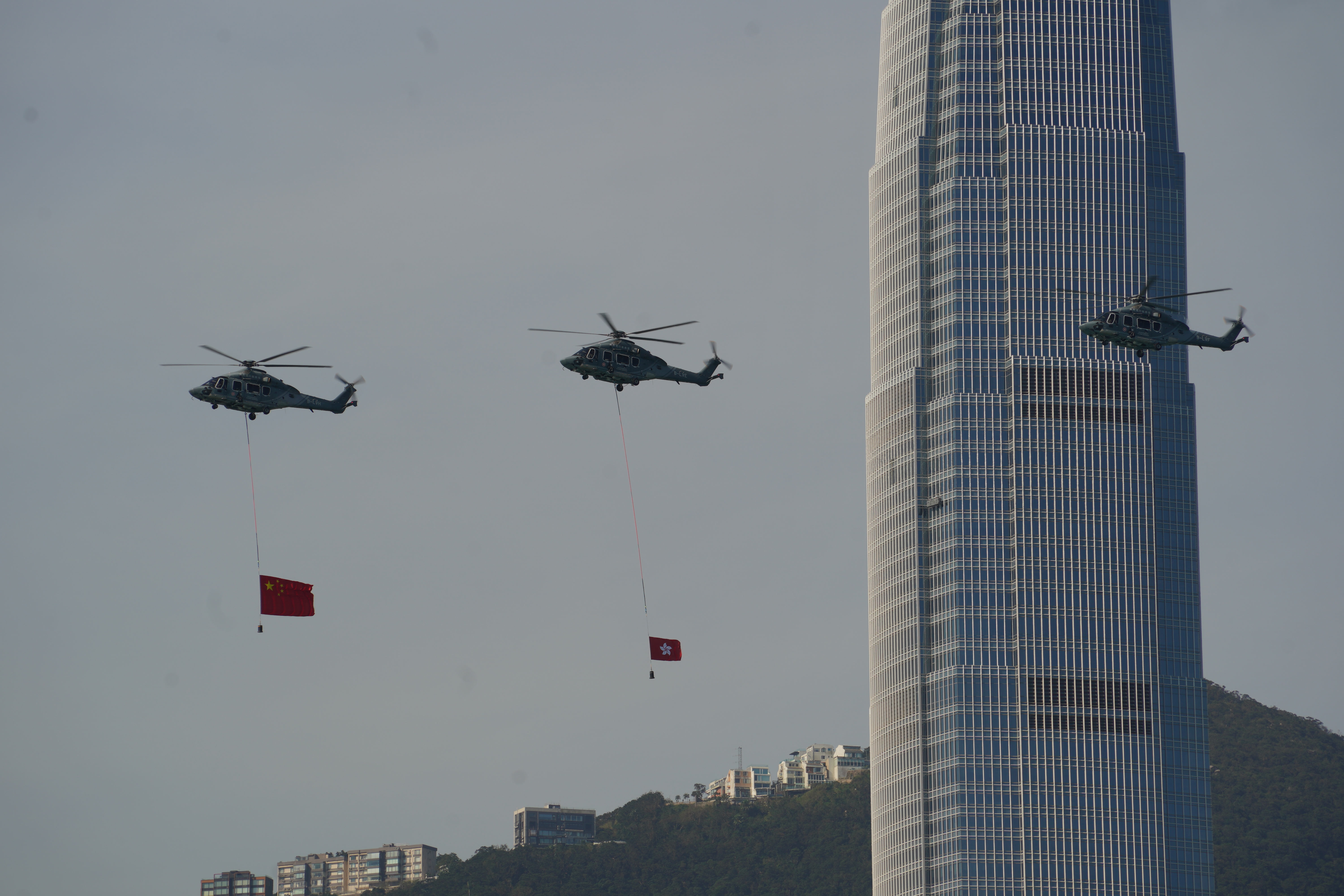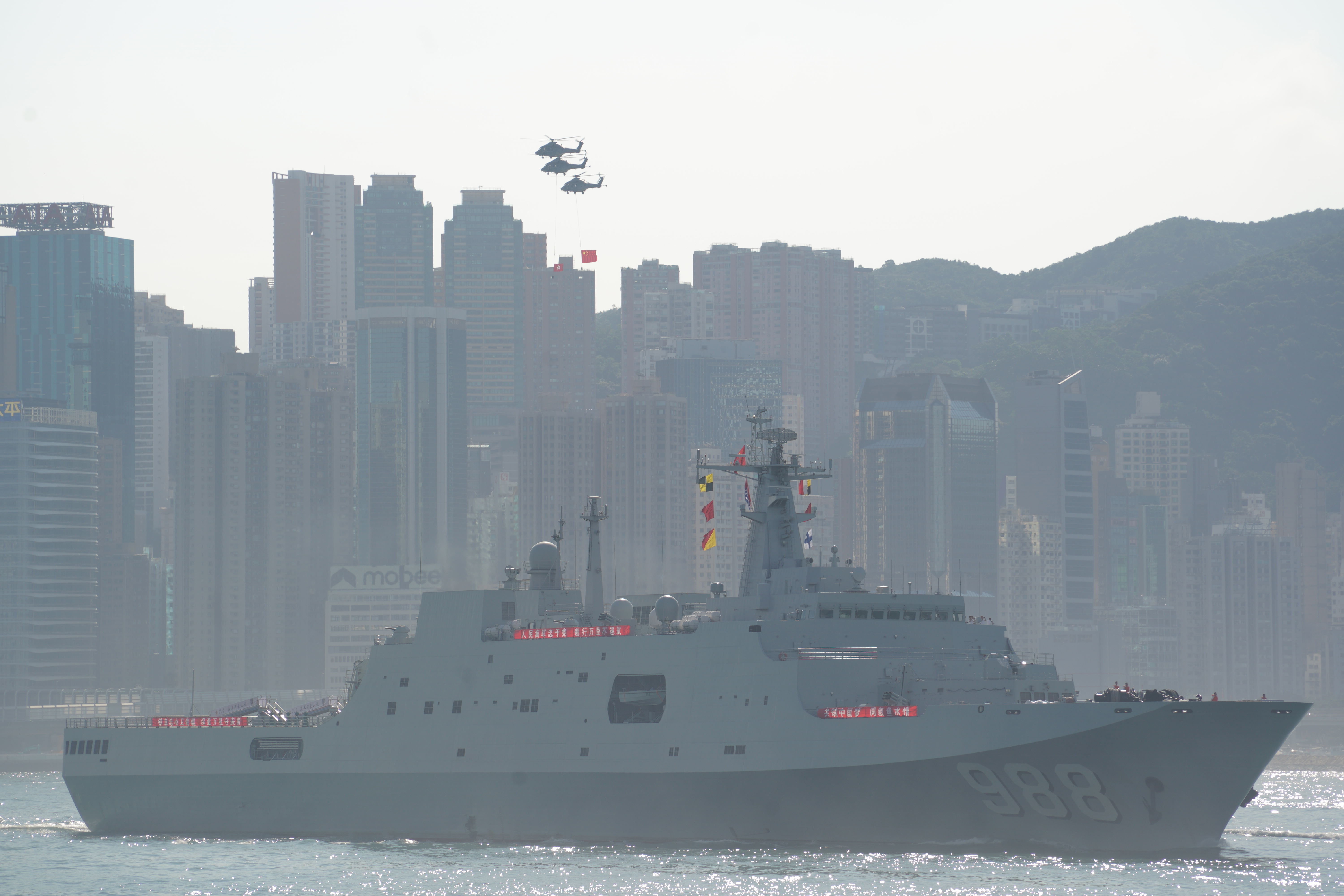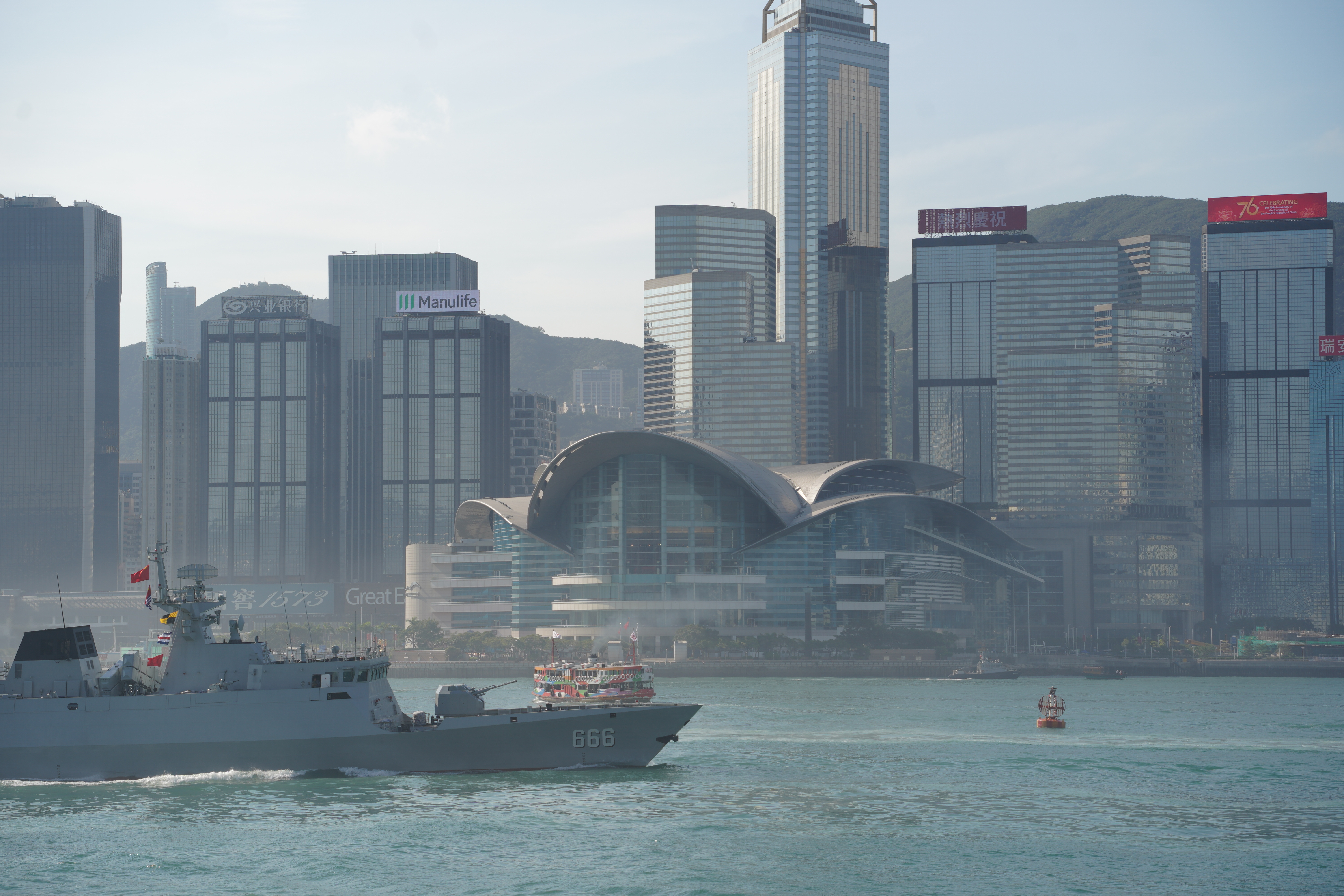軍艦駛過維多利亞港,留下了軍艦與中環摩天輪同框等畫面;戚繼光艦上,有「向海圖強擔使命 愛民護港踐初心」「強軍逐夢向深藍 魚水情深滿香江」的橫幅;軍艦上,亦有英姿颯爽、氣宇軒昂的海軍,站姿筆直如松;還有不少遊客、市民藉此機會「打卡」,與軍艦合影。此外,在維多利亞港上空,有直升機懸掛五星紅旗和紫荊花旗飛過。