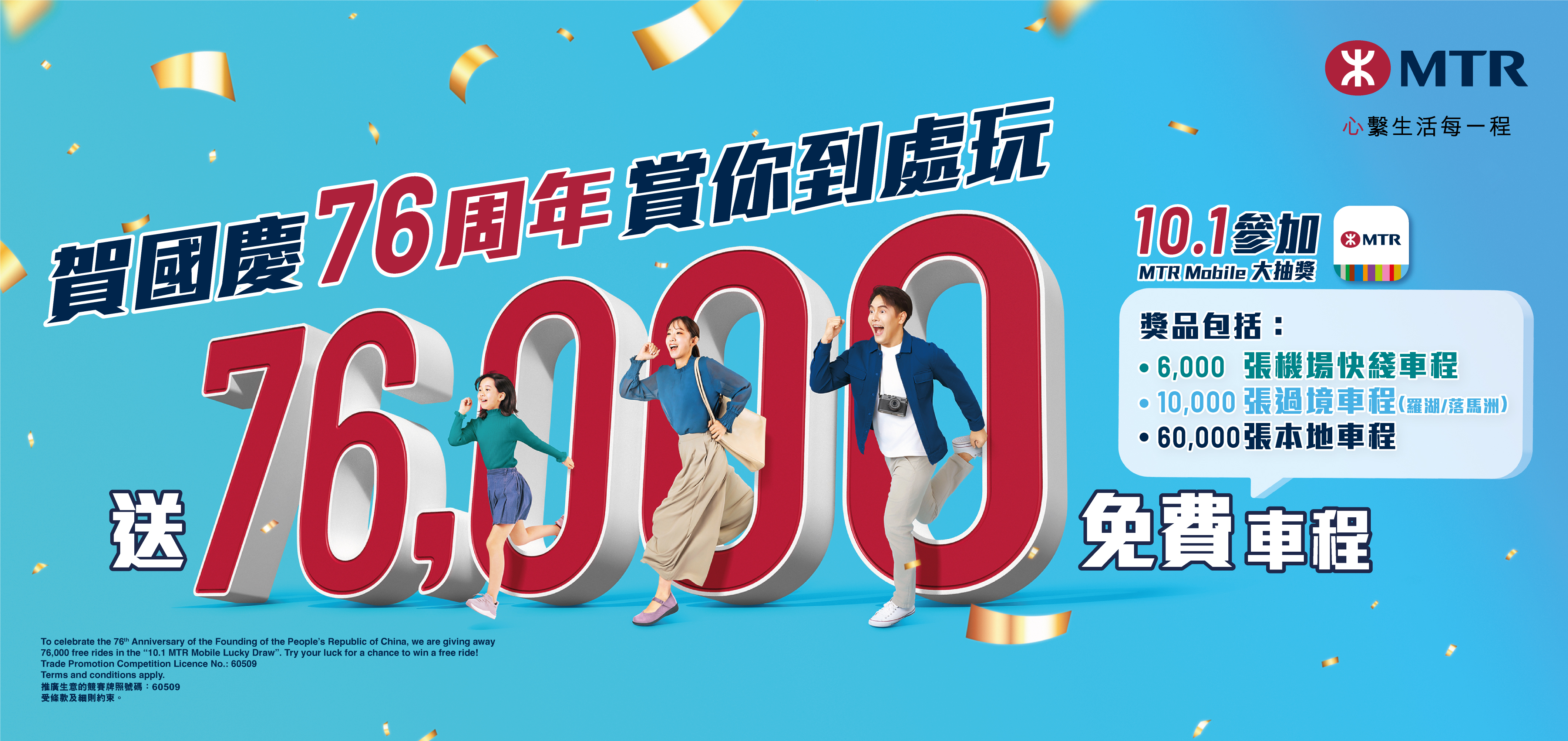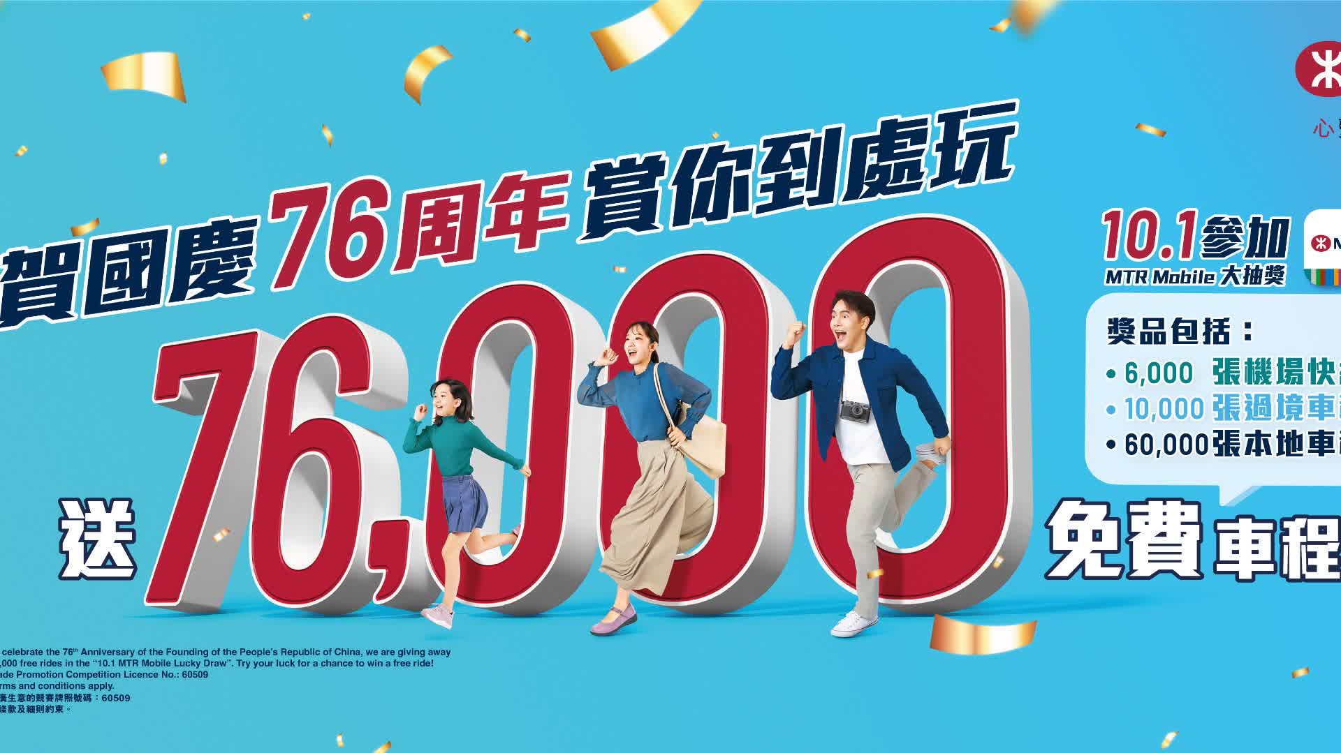 大公文匯全媒體報道,為慶祝中華人民共和國成立76周年,港鐵將於明日(10月1日)透過MTR Mobile送出共76000份單程車程,適用於本地鐵路綫、往返羅湖及落馬洲站過境路綫和機場快綫。只要登記成為港鐵會員,即可在國慶當日參與抽獎,即抽即知中獎與否。