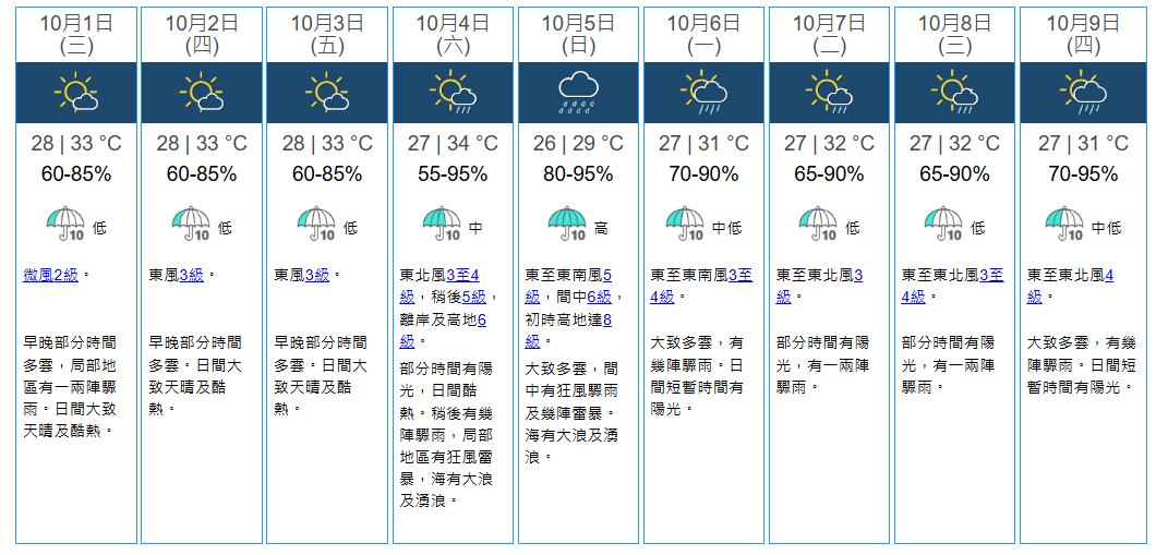 根據天文台九天天氣預報,明日10月1日早晚部分時間多雲,局部地區有一兩陣驟雨,吹微風,明早最低氣溫約28度,日間大致天晴及酷熱,市區最高氣溫約33度,新界再高一兩度;隨後一兩日大致天晴及持續酷熱,至星期六(10月4日)天氣轉差,星期日「迎月」(10月5日)更會有狂風驟雨及幾陣雷暴,海有大浪及湧浪,吹東至東南風5級,間中6級,初時高地達8級。不過隨着高空反氣旋再度增強,中秋節(10月6日)及翌日「追月」(10月7日)廣東沿岸驟雨逐漸減少,天色逐步好轉。