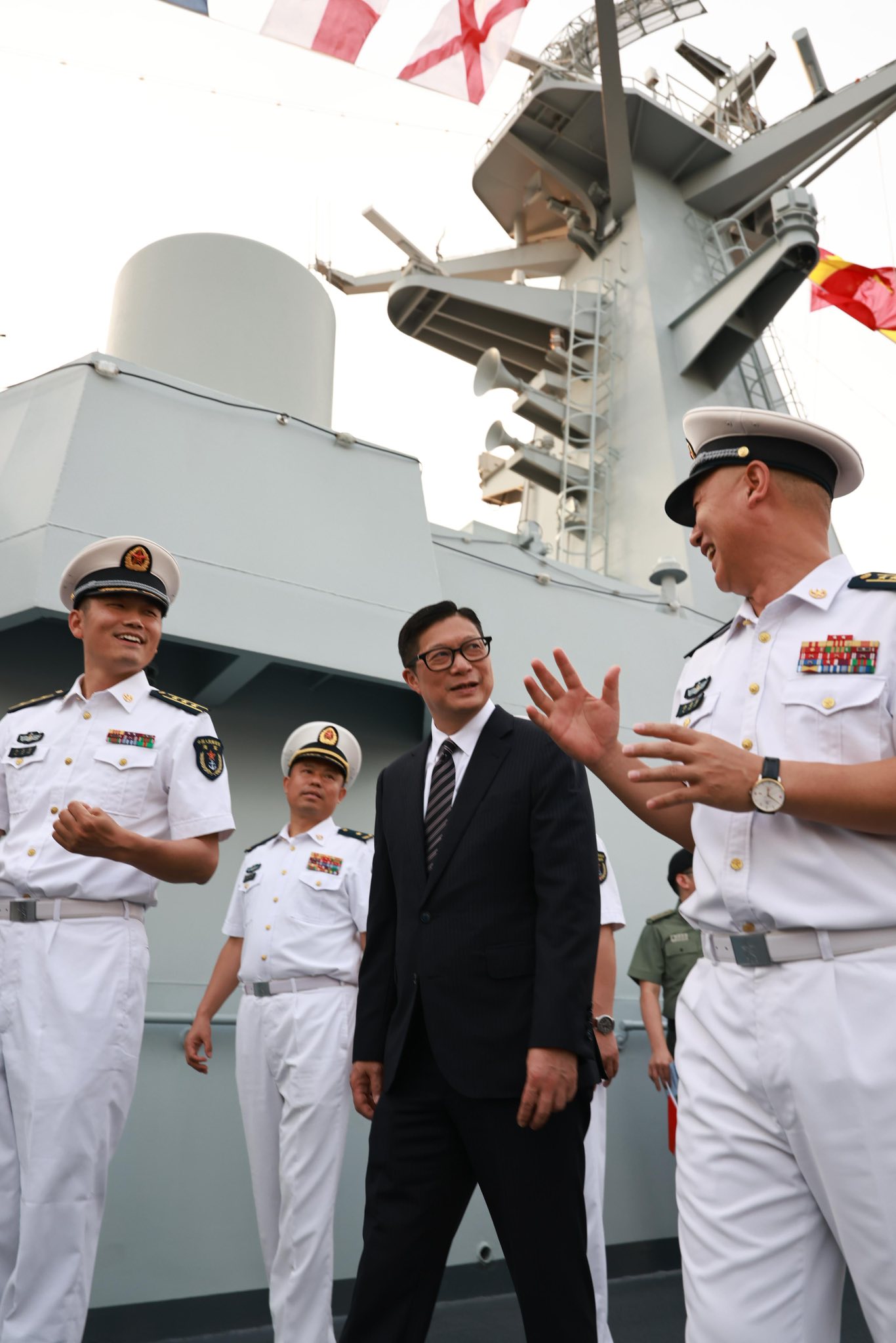 今日下午,保安局局長鄧炳強和一眾紀律部隊首長代表登上首次赴港的戚繼光艦和沂蒙山艦參觀,並與解放軍海軍交流。