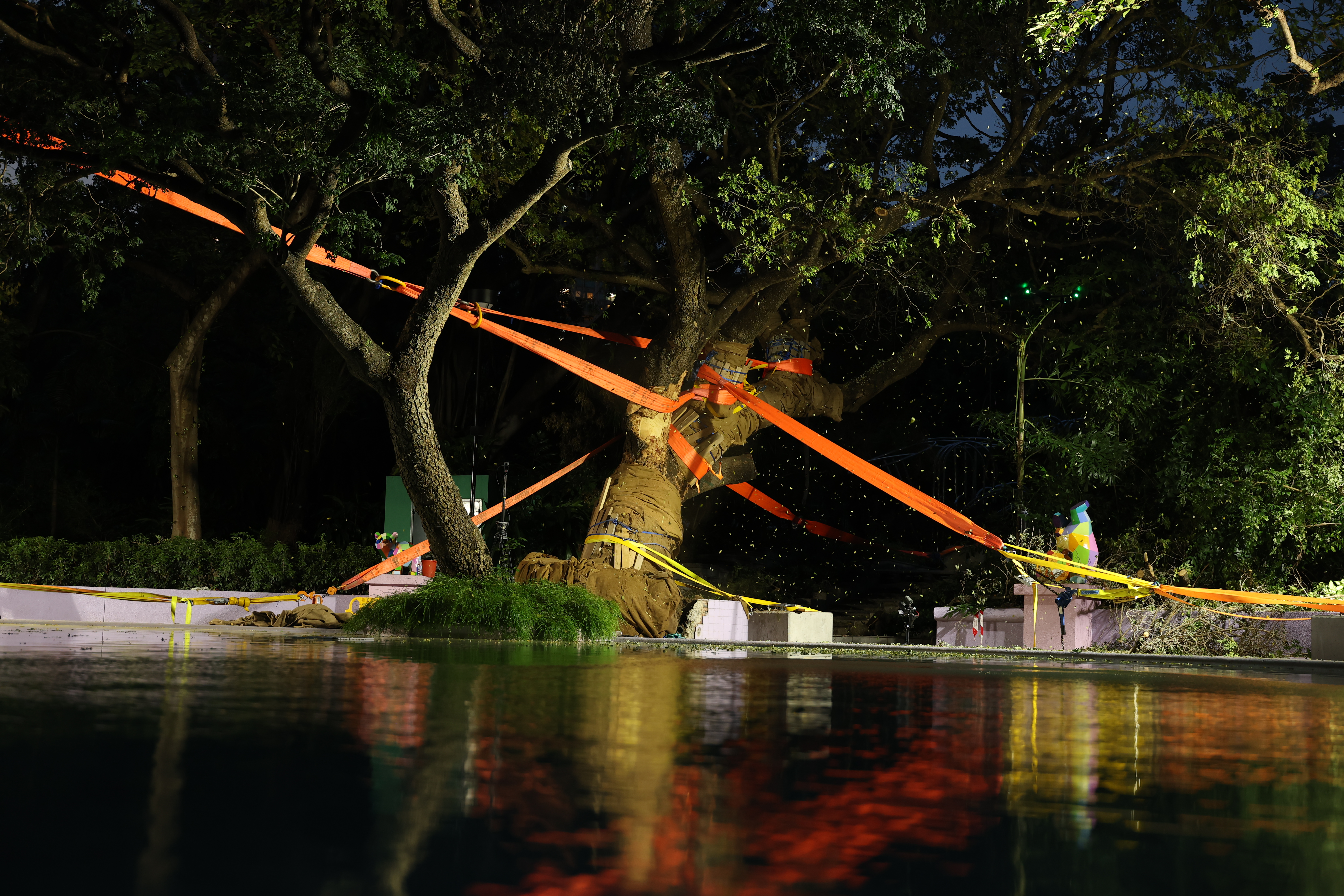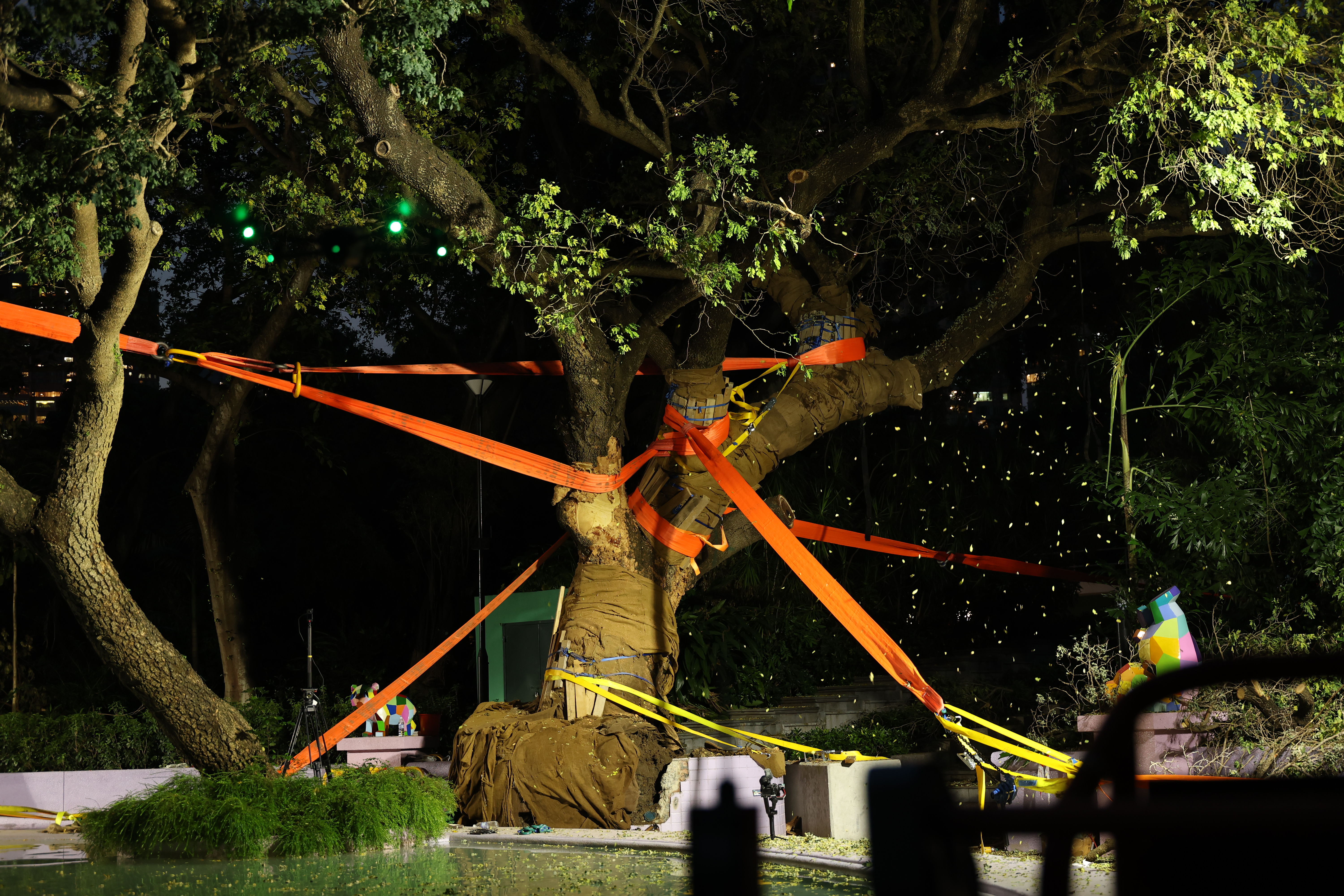 義工隊採取急救措施:首先,建議以麻布袋覆根鎖水、淋水補濕、築牢第一道生命防線;其後,啟動「雙保險」——邀請兩家業內知名園藝公司的園林專家參與擬定方案,透過交叉論證,擇取最佳對策;第三,調配兩架大型吊機,測算模擬斜拉方案。