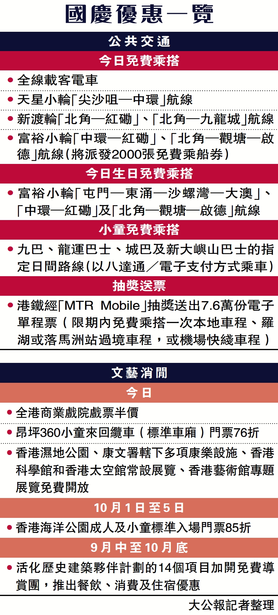 國慶與中秋黃金周期間,本港慶祝活動多籮籮,今日沙田馬場舉行國慶賽馬日,市民可免費進入沙田及跑馬地馬場公眾席,持有效來港旅遊證件或護照的旅客進場後,到訪「遊客專區」即可免費參觀「360體驗區」,沙田馬場「百勝廳」及「駿星匯」推出指定套餐七六折優惠。全港逾百個商場及百貨公司推出多項優惠禮遇。全港約3000間食肆和商戶推出國慶餐飲優惠,包括餐廳堂食可享全單七折、買一送一、折扣價購買指定套餐等。多項公共交通工具提供票價優惠。