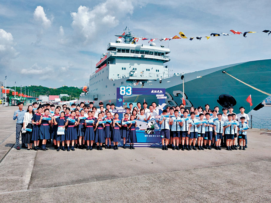 (香港文匯報 記者 嚴鍇華)今日(1日)是中華人民共和國成立76周年紀念日,香港洋溢着濃濃的愛國情與喜慶氣氛。正在執行遠海實習任務的中國人民解放軍海軍戚繼光艦、沂蒙山艦,首次赴香港組織艦艇開放活動,這也是香港回歸祖國後海軍艦艇第十次赴港。軍艦昨日(30日)經過維多利亞港駛向昂船洲,停靠在駐港部隊昂船洲軍港,今日至明日供已預約的市民免費參觀。昨日下午,艦艇率先開放予香港青少年學生等不同群體參觀,有學生已多次參觀軍艦並成長為小小軍事迷,不僅了解國家軍事實力的發展,亦培養了愛國情,要再次親眼見證海軍艦艇,「前一晚興奮到睡不着覺!」近年愈來愈多的類似活動,更讓香港年輕一代感受到祖國對香港的厚愛,他們昨日在艦艇前情不自禁地高呼:「祖國生日快樂!」