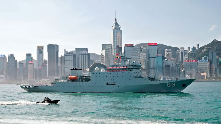 戚繼光艦和沂蒙山艦昨日在香港特區政府船隊和駐香港部隊艦艇伴航下進入香港附近水域。戚繼光艦懸掛醒目的橫幅:「向海圖強擔使命 愛民護港踐初心」及「強軍逐夢向深藍 魚水情深滿香江」;沂蒙山艦則懸掛「人民海軍忠於黨 艦行萬里不迷航」、「鐵血忠心衛海疆 深藍萬里守安瀾」及「共築中國夢 同敘魚水情」橫幅,展現了海軍將士的使命擔當。