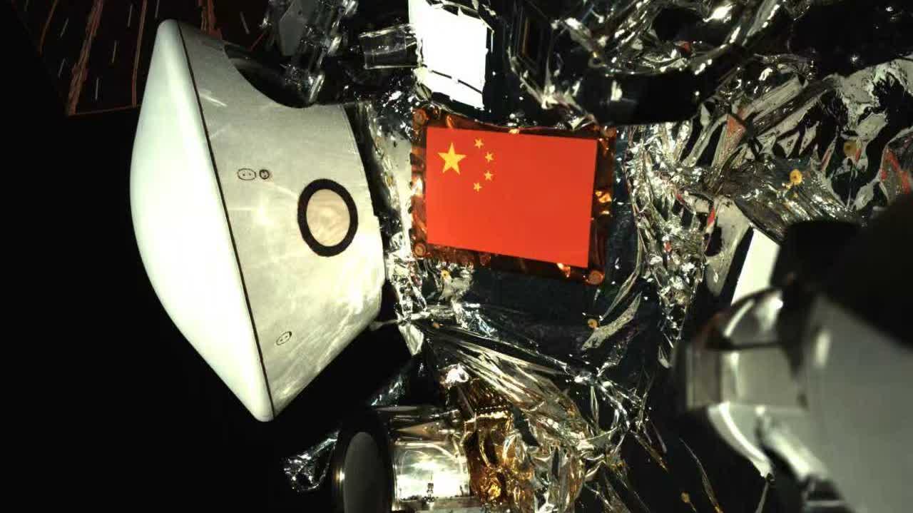 此次發布的天問二號與地球合影圖像由安裝在探測器機械臂上的監視相機拍攝,鮮艷的五星紅旗、白色的返回艙和遠處藍色的地球構成了一幅令人無限遐想的美妙畫面。