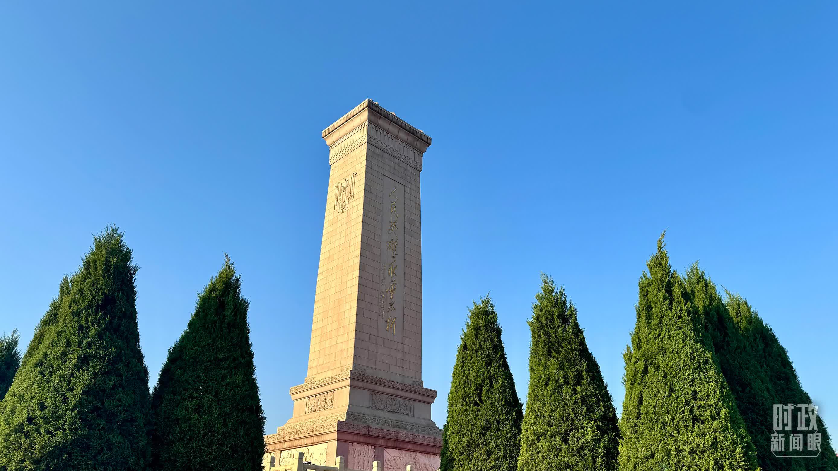 天安門廣場上,人民英雄紀念碑前,紅旗獵獵。白菊等鮮花組成的18個花環擺放在紀念碑北側。深沉悠遠的烈士紀念日號角表達對英烈的深情追思。