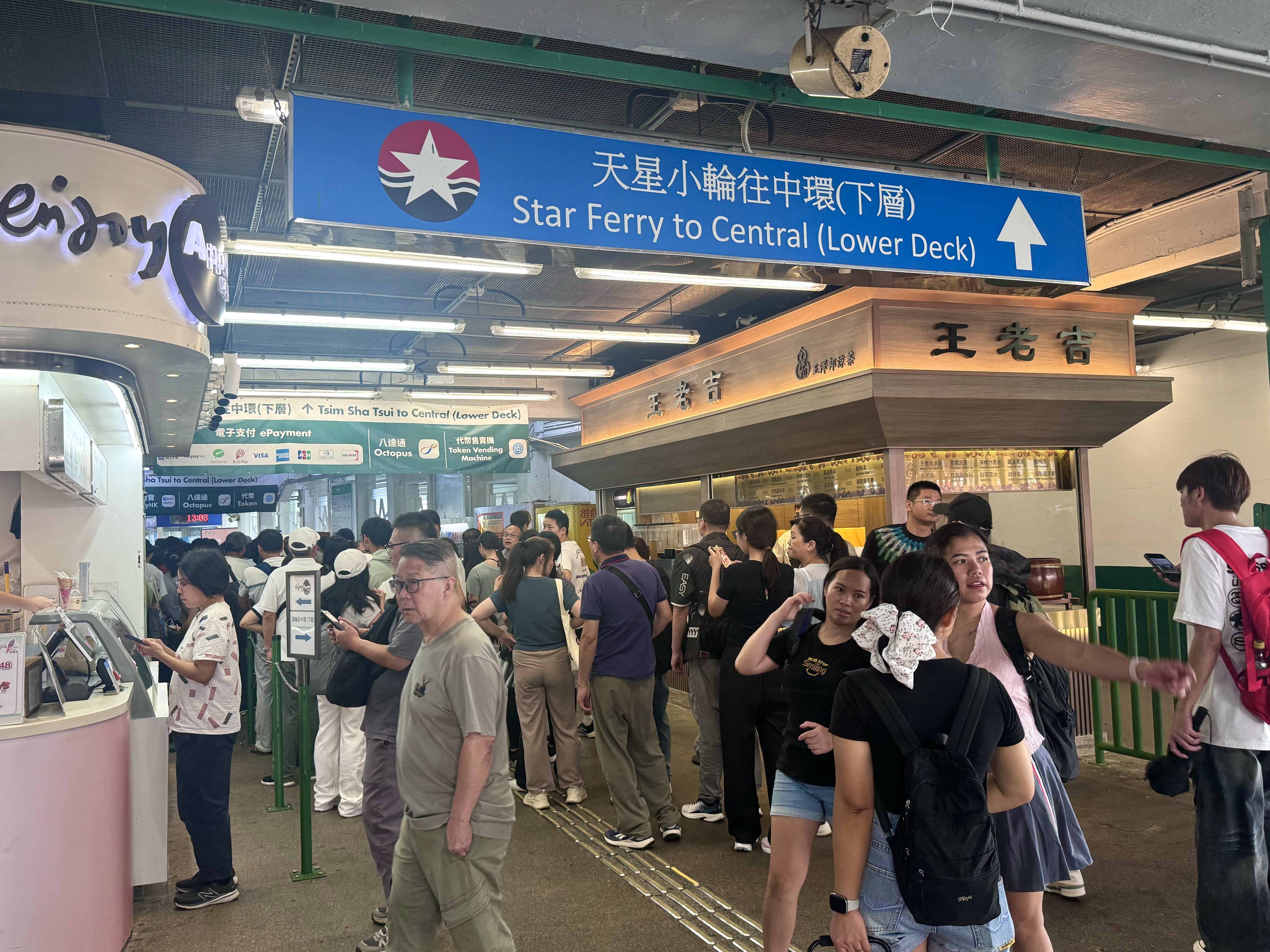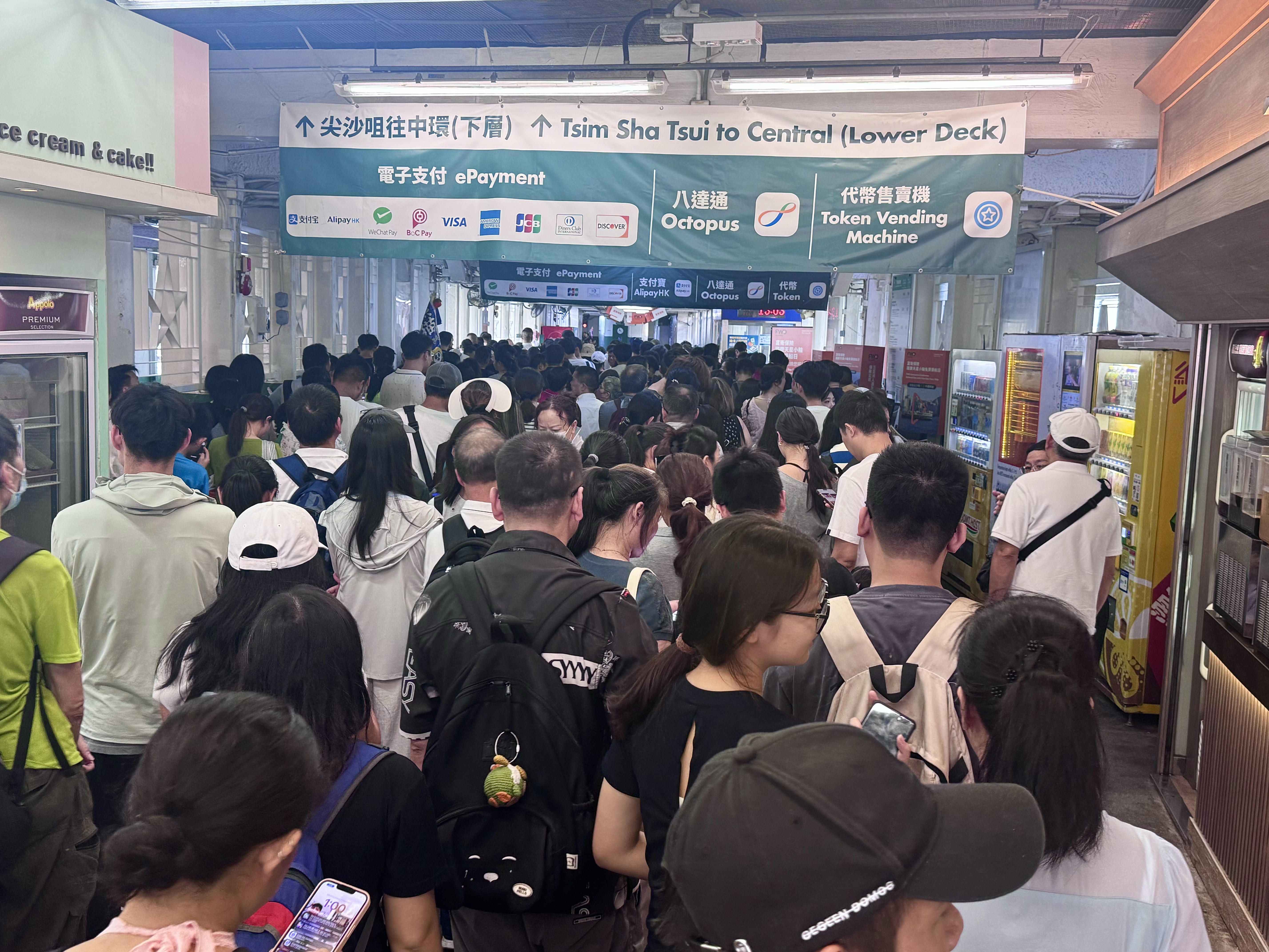 記者今日實測部分免費交通,發現乘搭過程順利,並未出現因人流過多而產生擁擠和混亂的現象。記者首先前往尖沙咀的天星碼頭,乘搭免費天星小輪到中環,整個行程共耗時約40分鐘。記者於下午1時左右開始排隊,此時乘船入口已經人潮湧湧,不過隊伍井然有序。據觀察,渡輪班次約10分鐘一班,記者在等待兩輪後順利入閘,並於下午1時半坐上船,最終經過約10分鐘的航行到達中環碼頭。