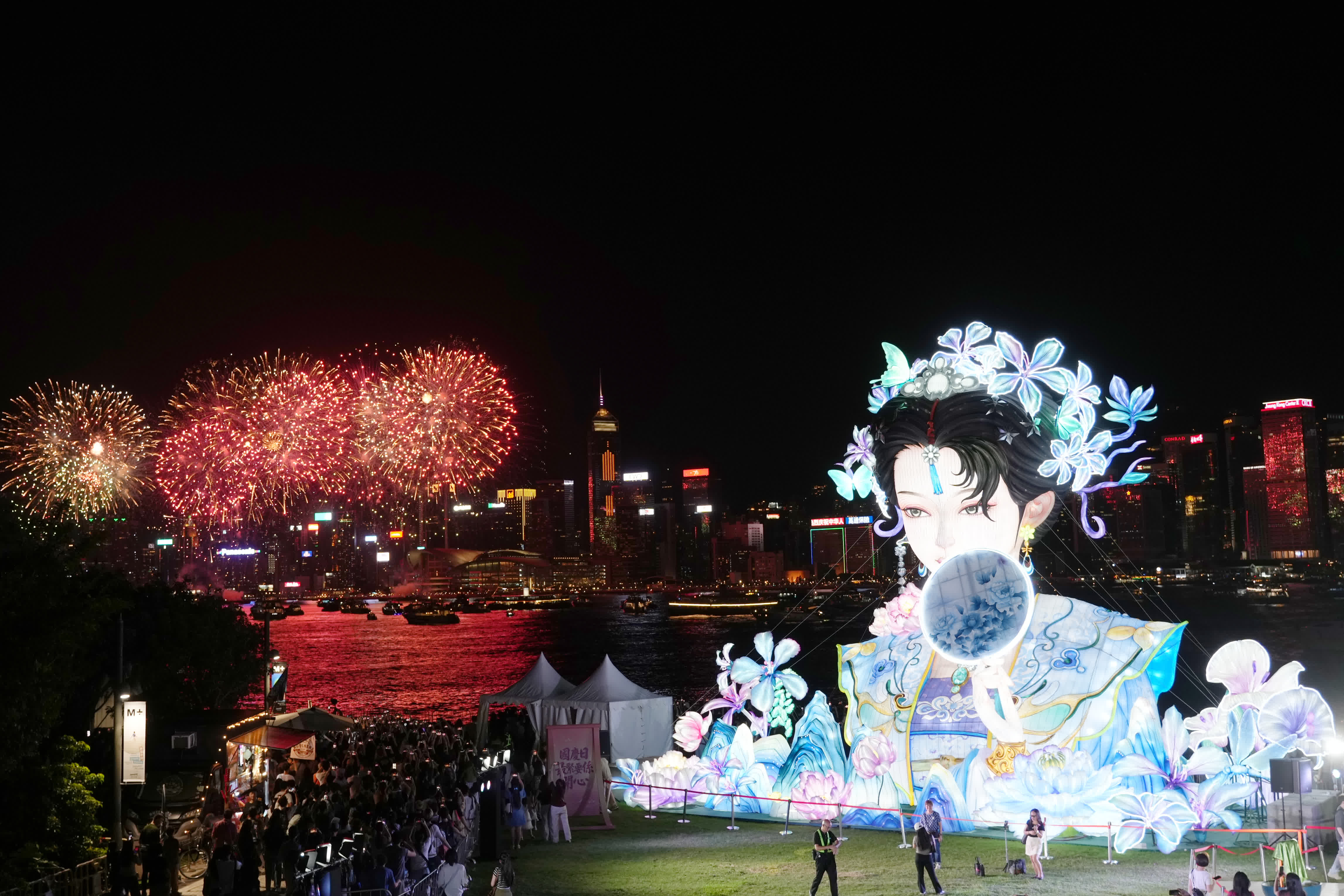 夜幕低垂,煙花秀點亮維港上空,與「紫霞仙子」主燈交相輝映。煙花以紅色為主,輔以黃色和綠色,綻放出大拇指、笑臉、愛心等奇特形狀,吸引不少市民早早到二樓佔位,只為同時捕捉花燈與煙花的絕佳角度。當最後一輪煙花盛放時,全場響起一片驚呼,將整晚氣氛推向高潮。